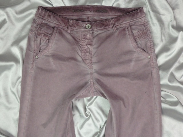 Kvalitné dámske nohavice staroružovej farby, vo švíkoch batikované, zapínanie na zips, materiál