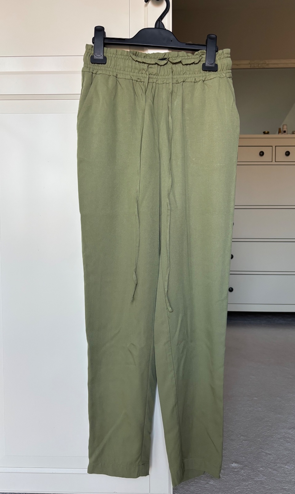 Pár x oblečene, bez známok nosenia. Mierne elastické. Sadnu aj na S, mne sú široké na stehnách,.preto posúvam.