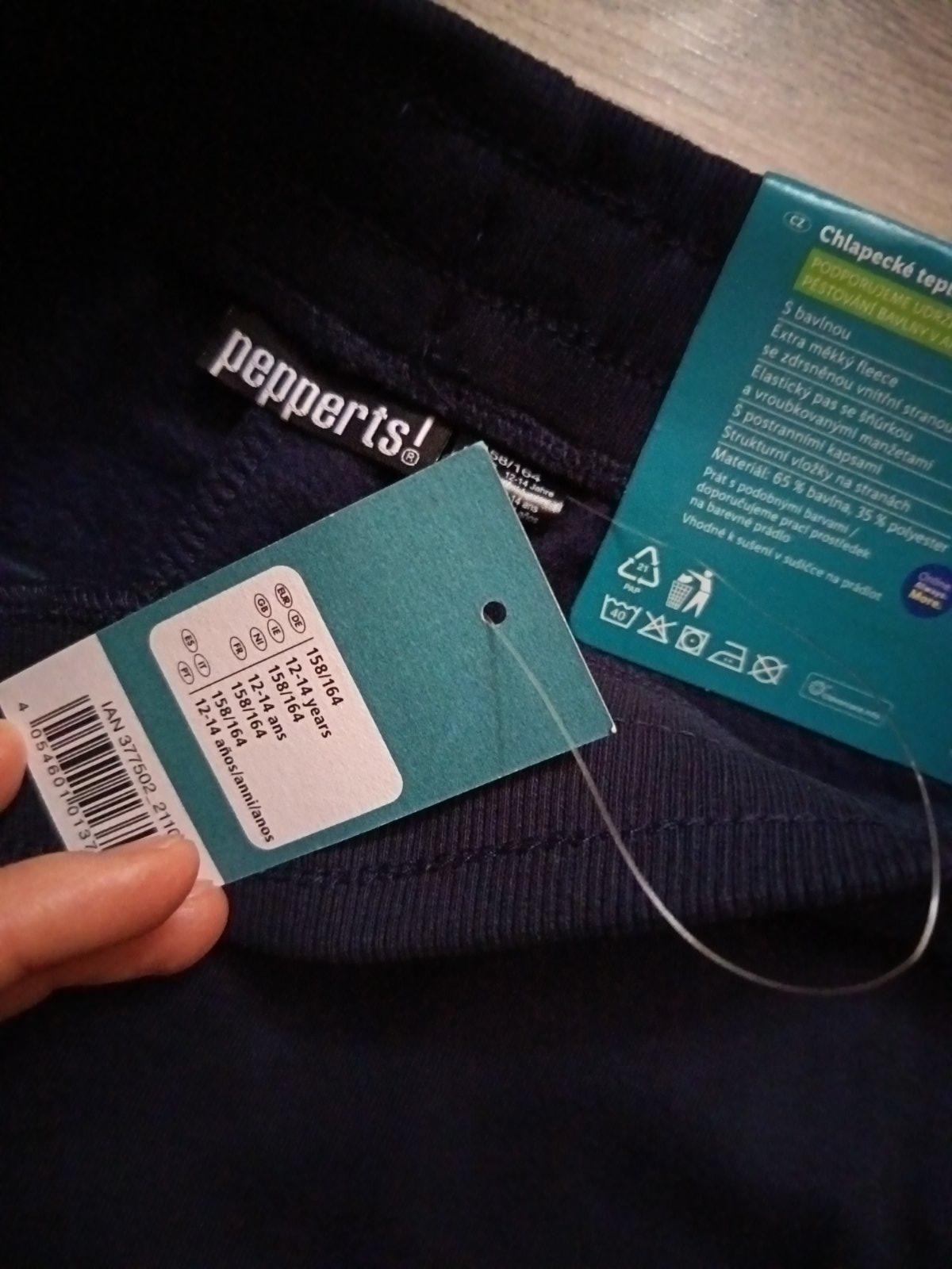 Tepláky s vreckami veľ. 158/164, v páse šnúrka, nosené krátko, výborný stav. Nevymieňam.