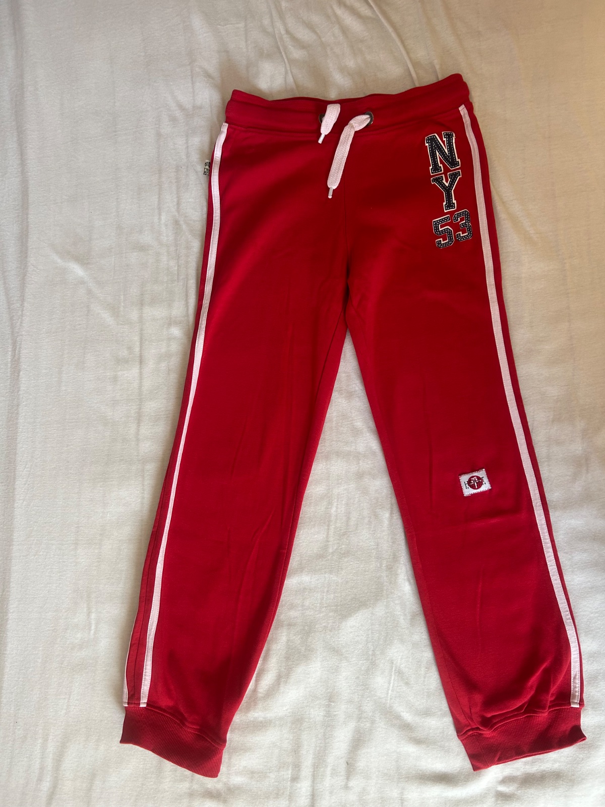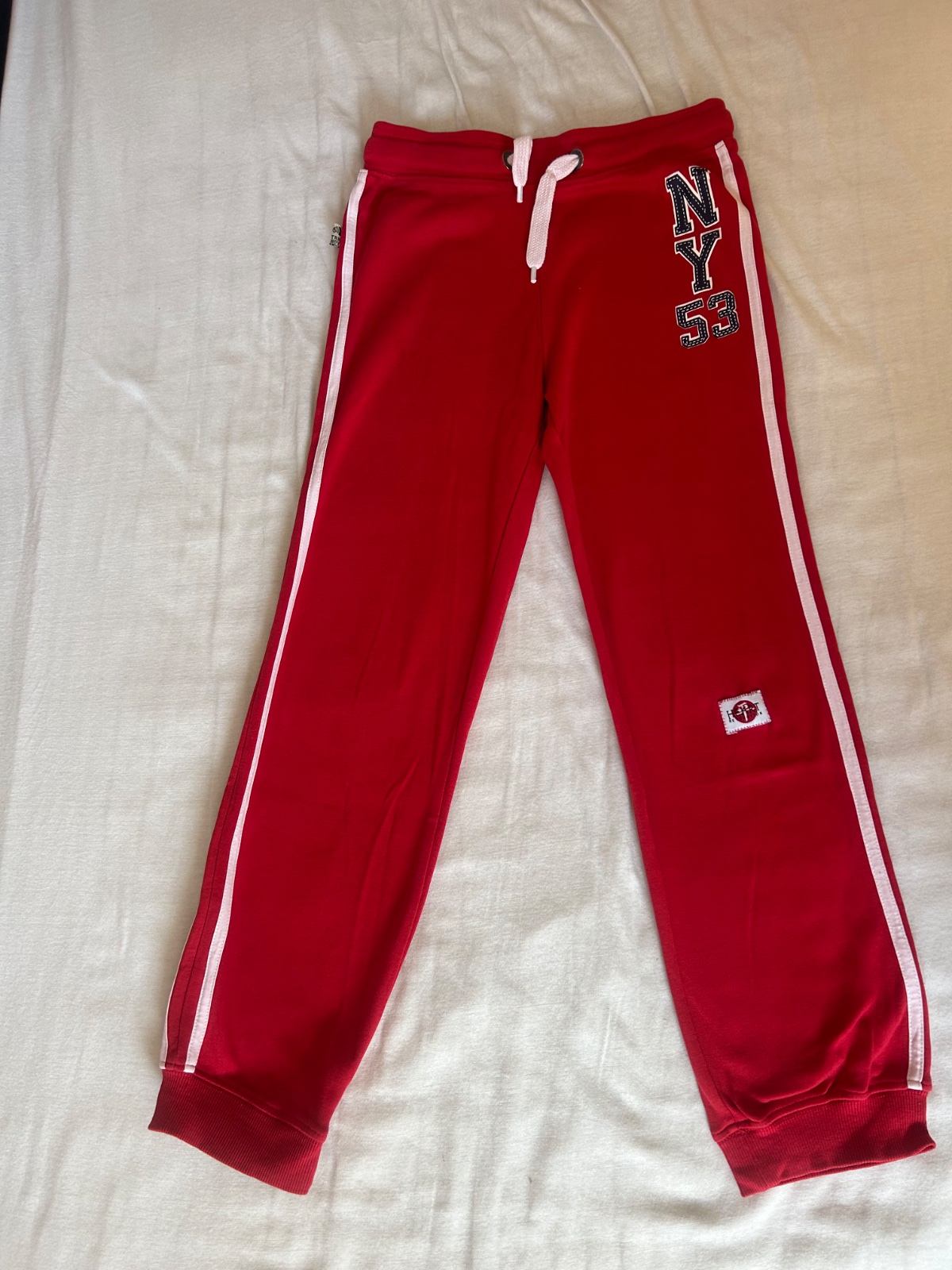 Málo nosené v dobrom stave, nevyblednuté. Dolu sa viažu, v páse s hrubou gumou a šnúrky. Pohodlné.