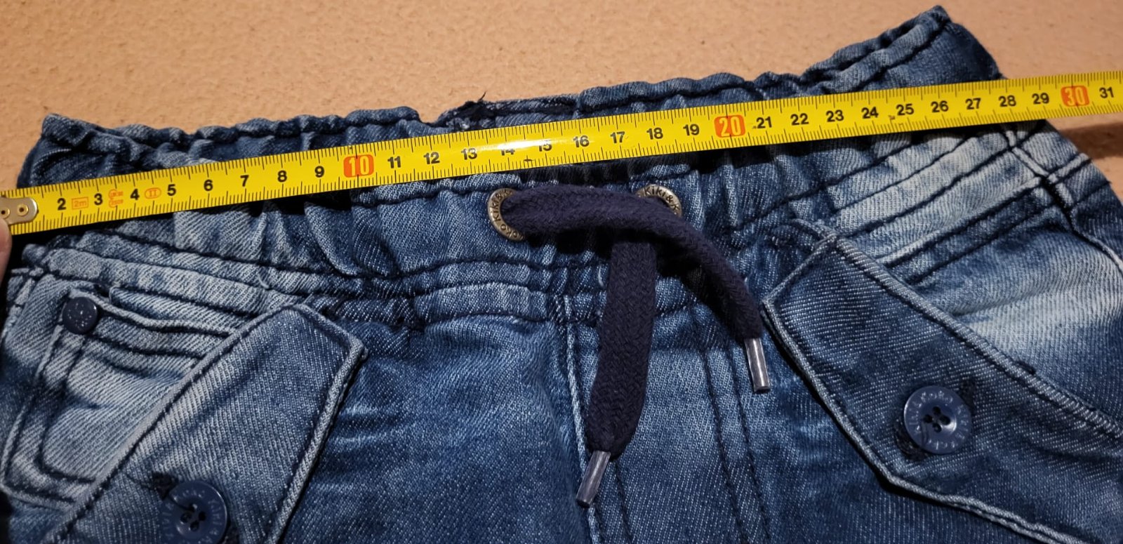 V páse bola natiahnutá guma, nakoľko boli synovi široké, zostali tam zašité dierky, zvonka nie sú vidieť.