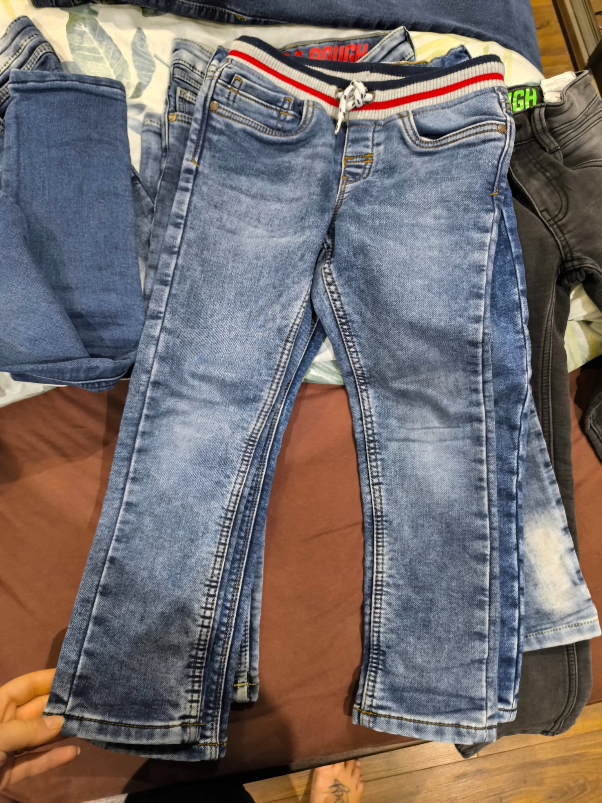 Pekný zachovalý stav, výborné pohodlné rifle, pružné a mäkké. Záplaty šité i krajčírky. Malý ich rád nosil, ozaj pohodlné. Tak na 6-7 rokov.