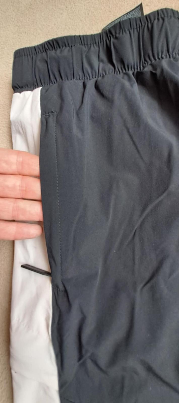 Kvalitné športové nohavice s podšívkou. Vrchný materiál 87% nylon / 13 % elastan, podšívka 100% bavlna ( tenký úplet ). Nie je klasická šuštiakovina. V páse guma a spona. 3 funkčné vrecká . Príjemné na dotyk. Málo nosené vo výbornom stave bez fľakov a poškodenia.