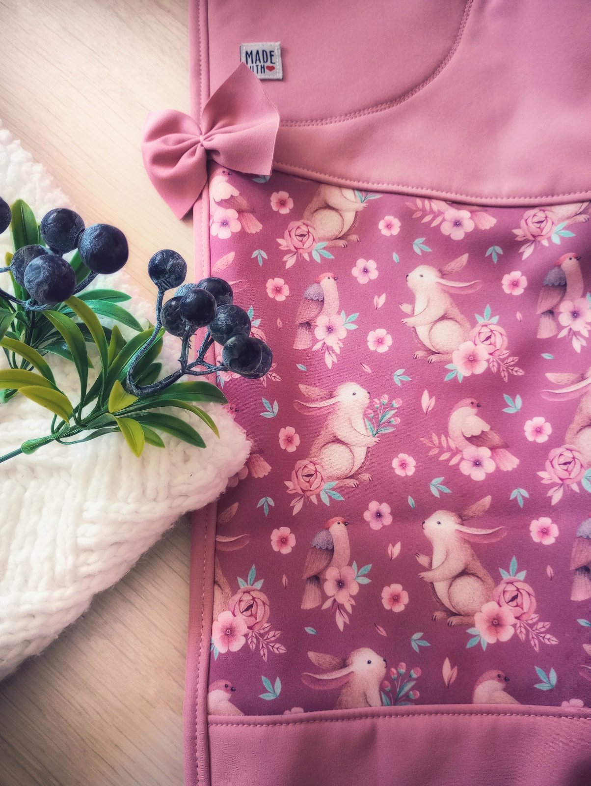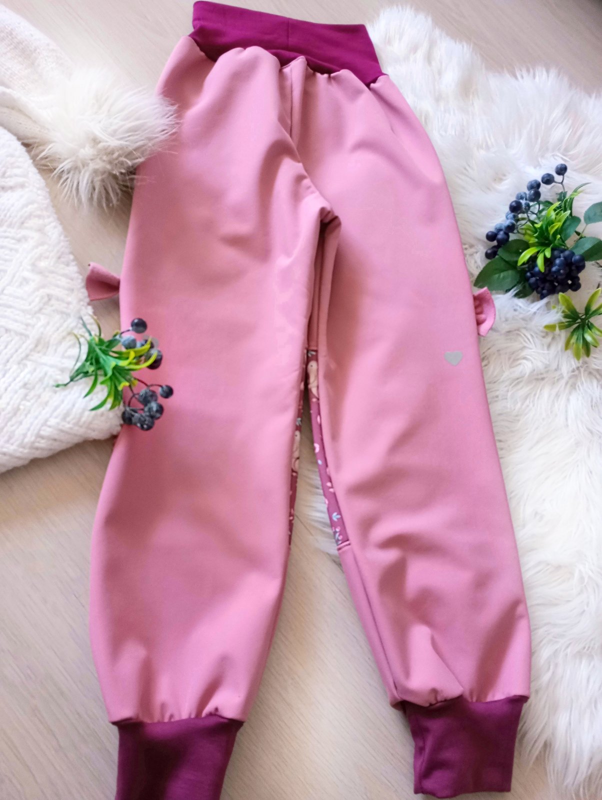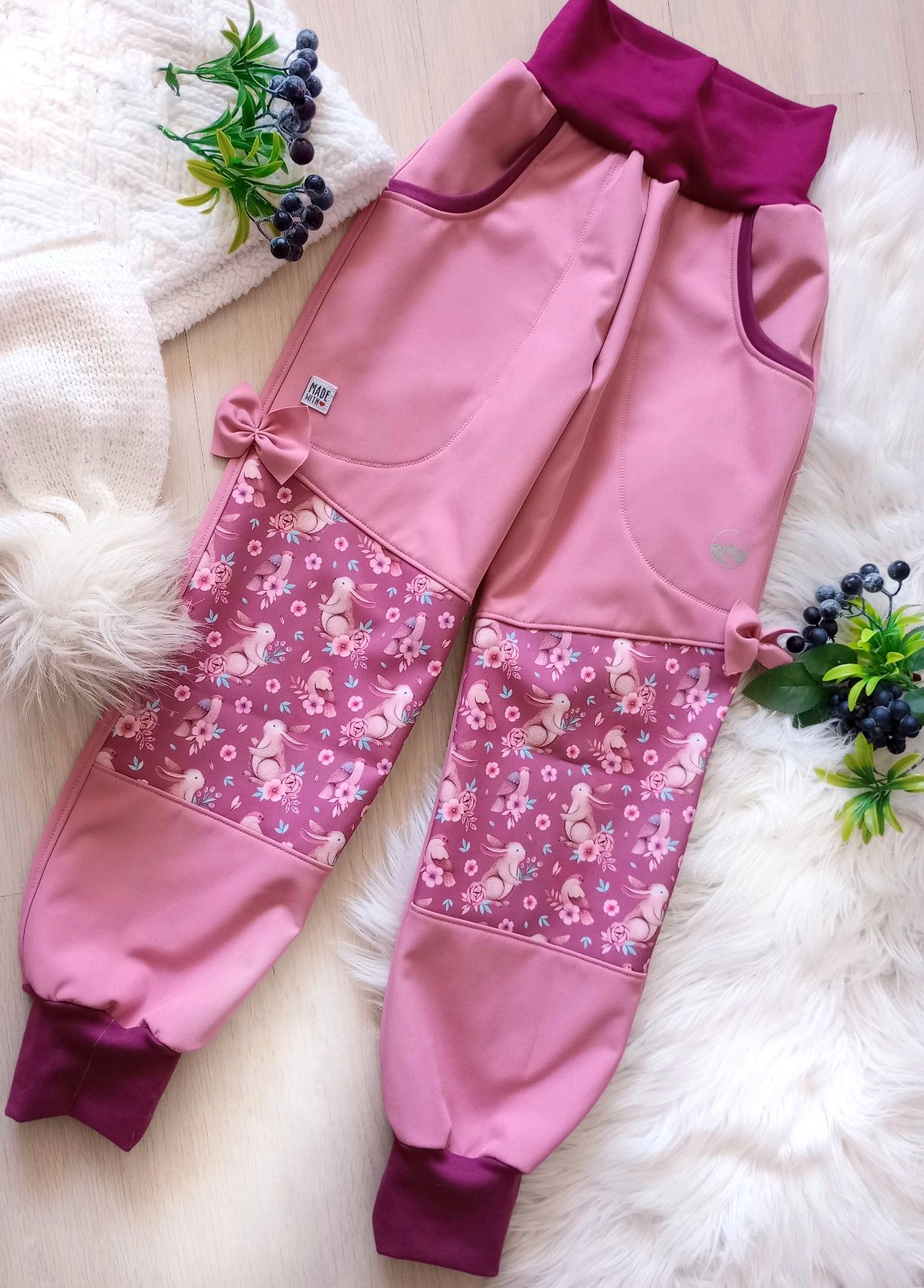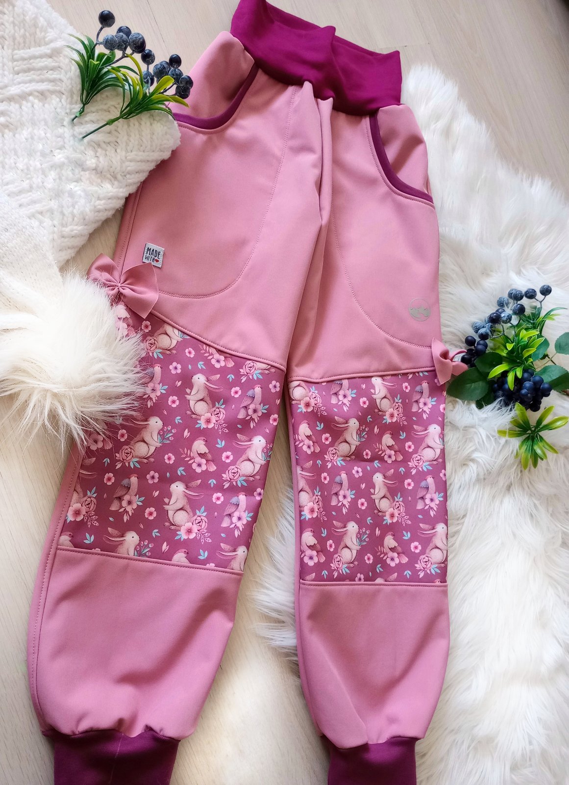 Rozkošné dievčenské softshellové nohavice staroružovej farby s obľúbeným motívom zajčikov s ozdobnými mašličkami, rastúcimi nápletmi a pohodlným mäkkým pásom. Zvnútra teplá flísová vrstva. Patenty je možné vyhrnúť a tak využívať oblečenie dlhšiu dobu. Patenty je možné zvoliť ružovo-fialové alebo staroružové.