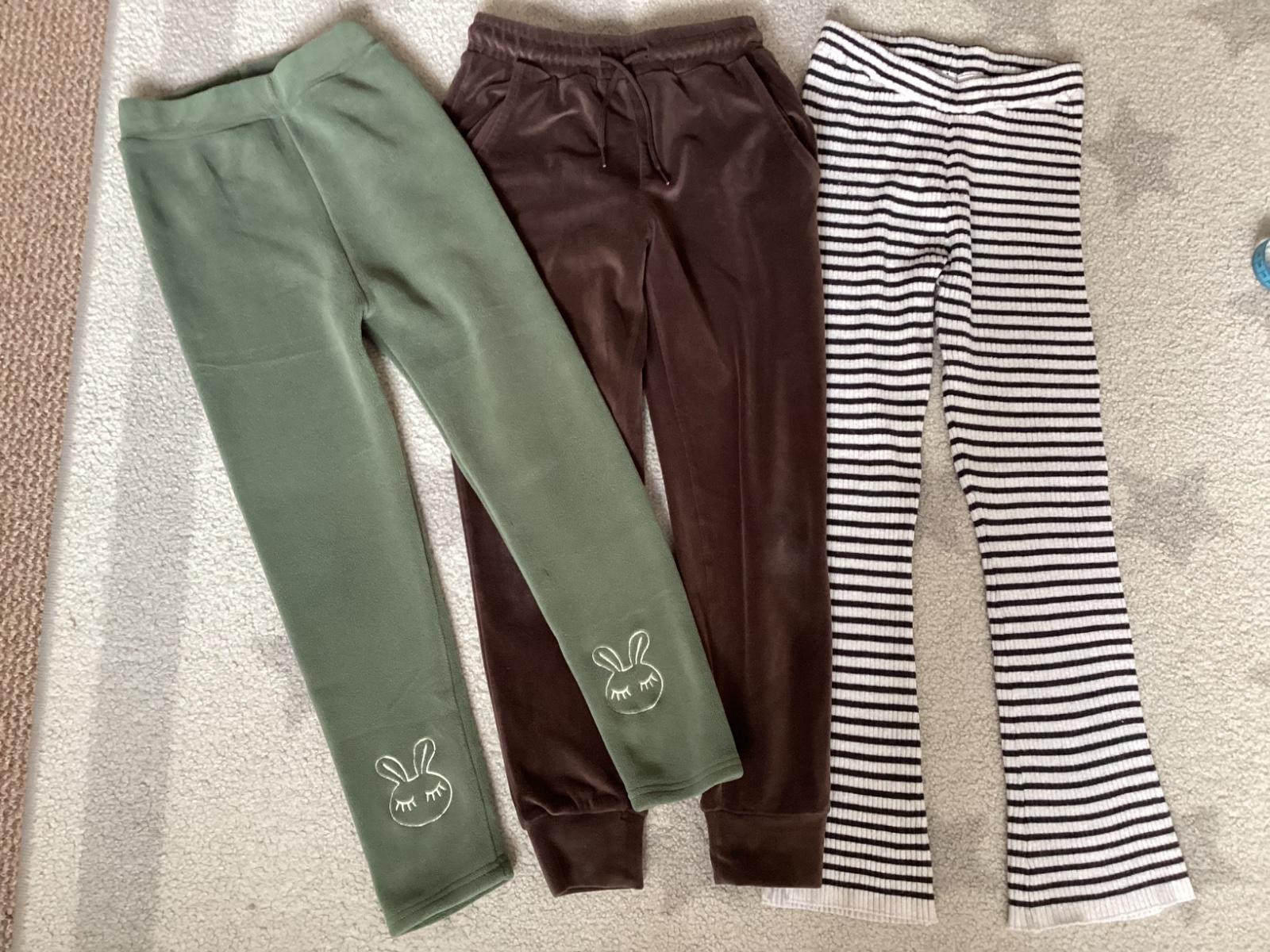 Zelené a pásikované su vo veľmi dobrom stave. Zelené sú veľmi teplé. Hnedé tepláky dávam ako bonus, majú vyšúchané kolená. Cena za všetky