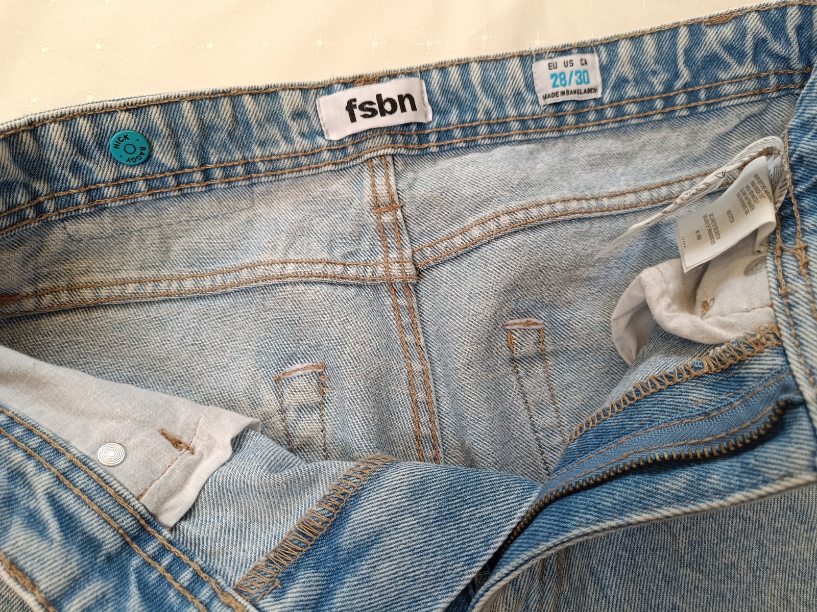 Veľmi pekné nové rifle, nosené asi raz. Kúpili sme, žiaľ, malú veľkosť. Pevnejšia džínsovina, strih Baggy, svetlo modrá farba