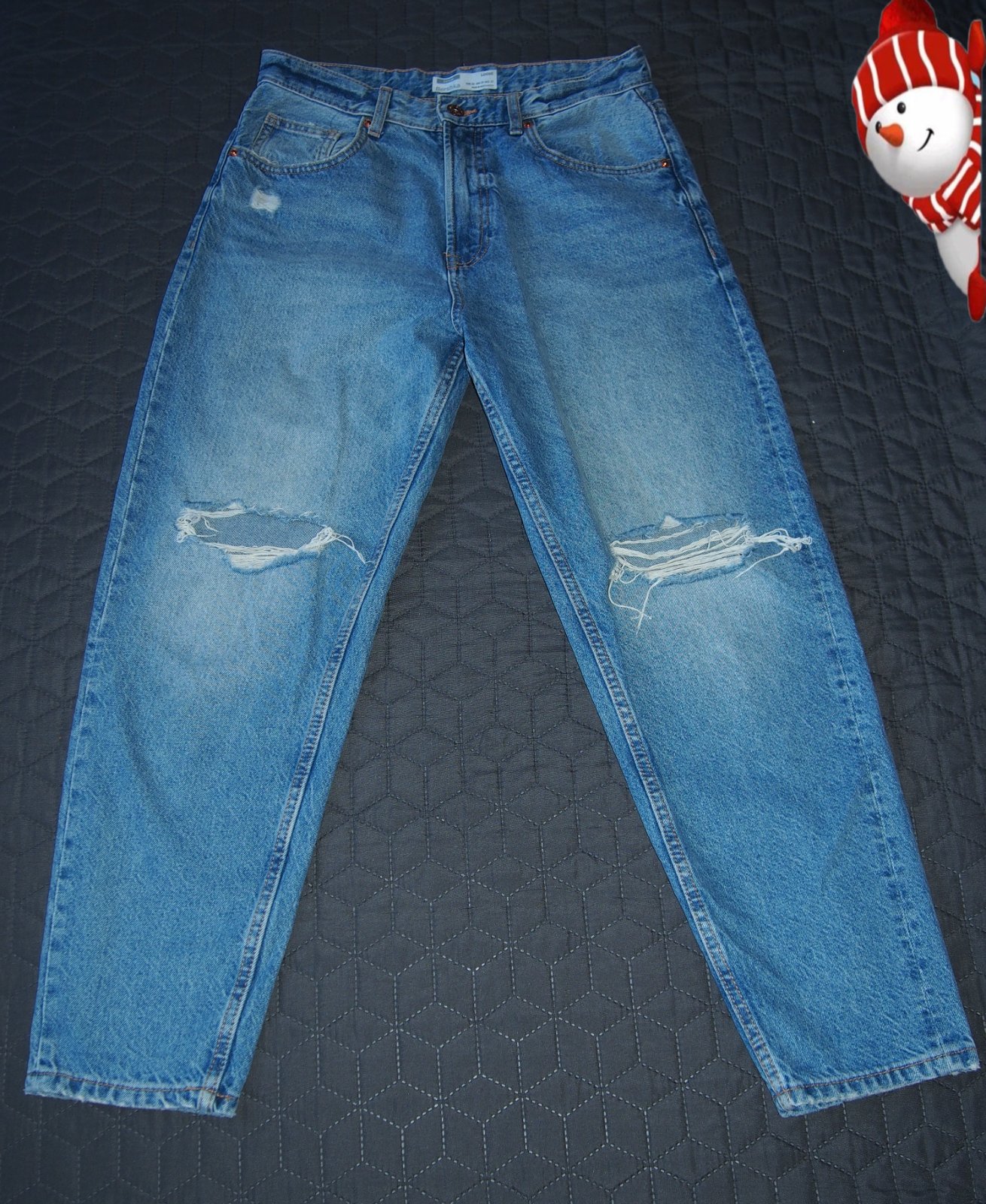 Bez poškodení.. ak sa to dá tak nazvať 😉 CD cca 96cm, vnútorná nohavica cca67cm, pás 2x 34 cm. Farba o trochu sytejsia niečo medzi prvou foto a detailom na velkost