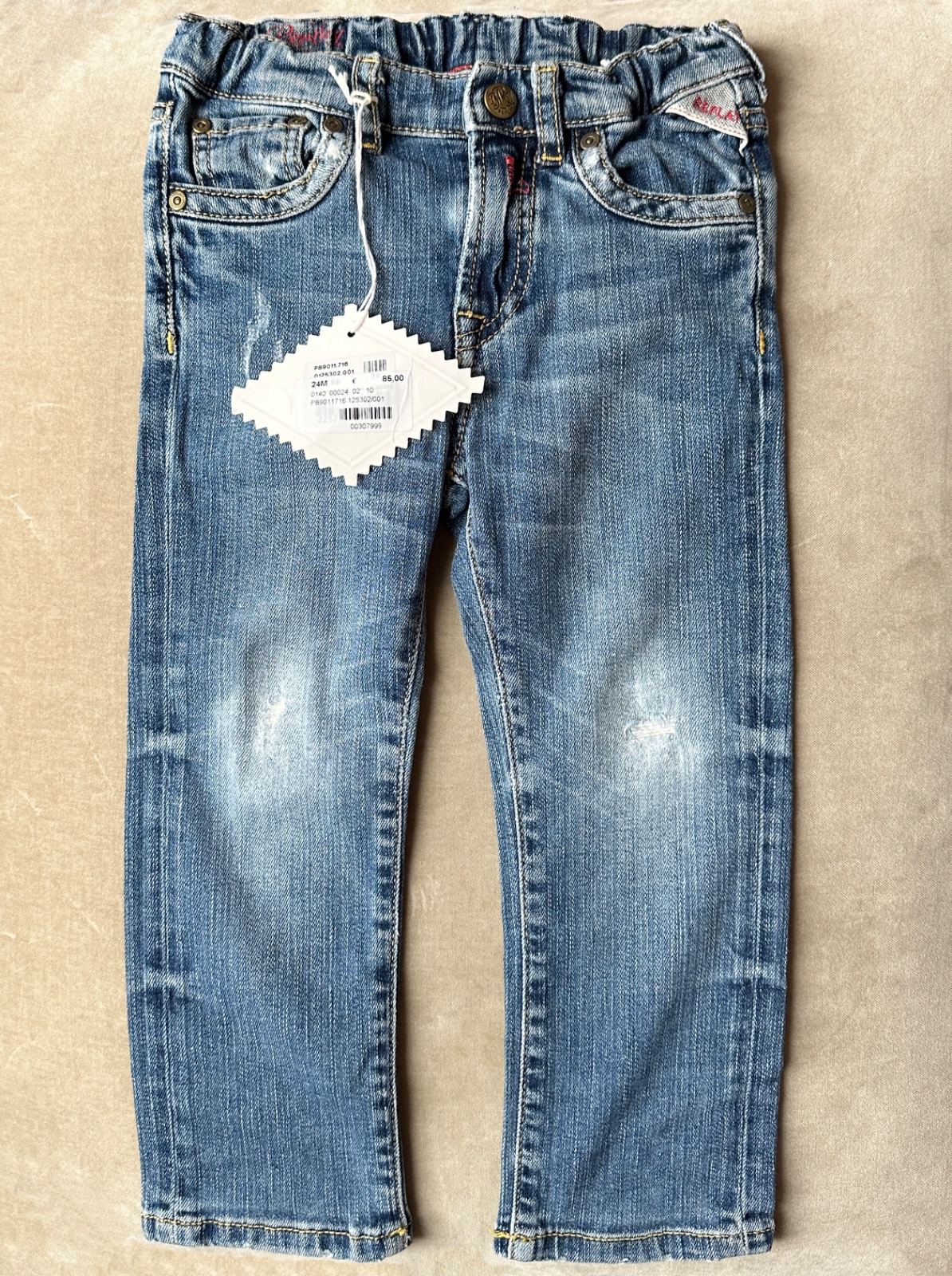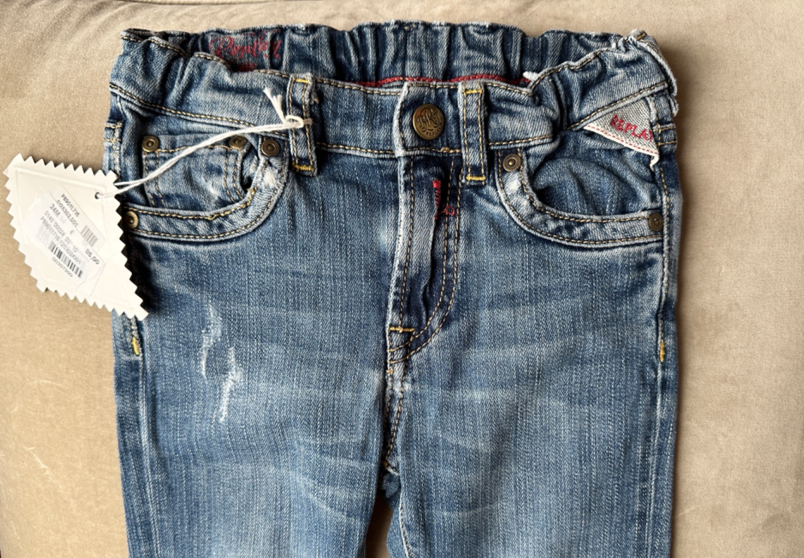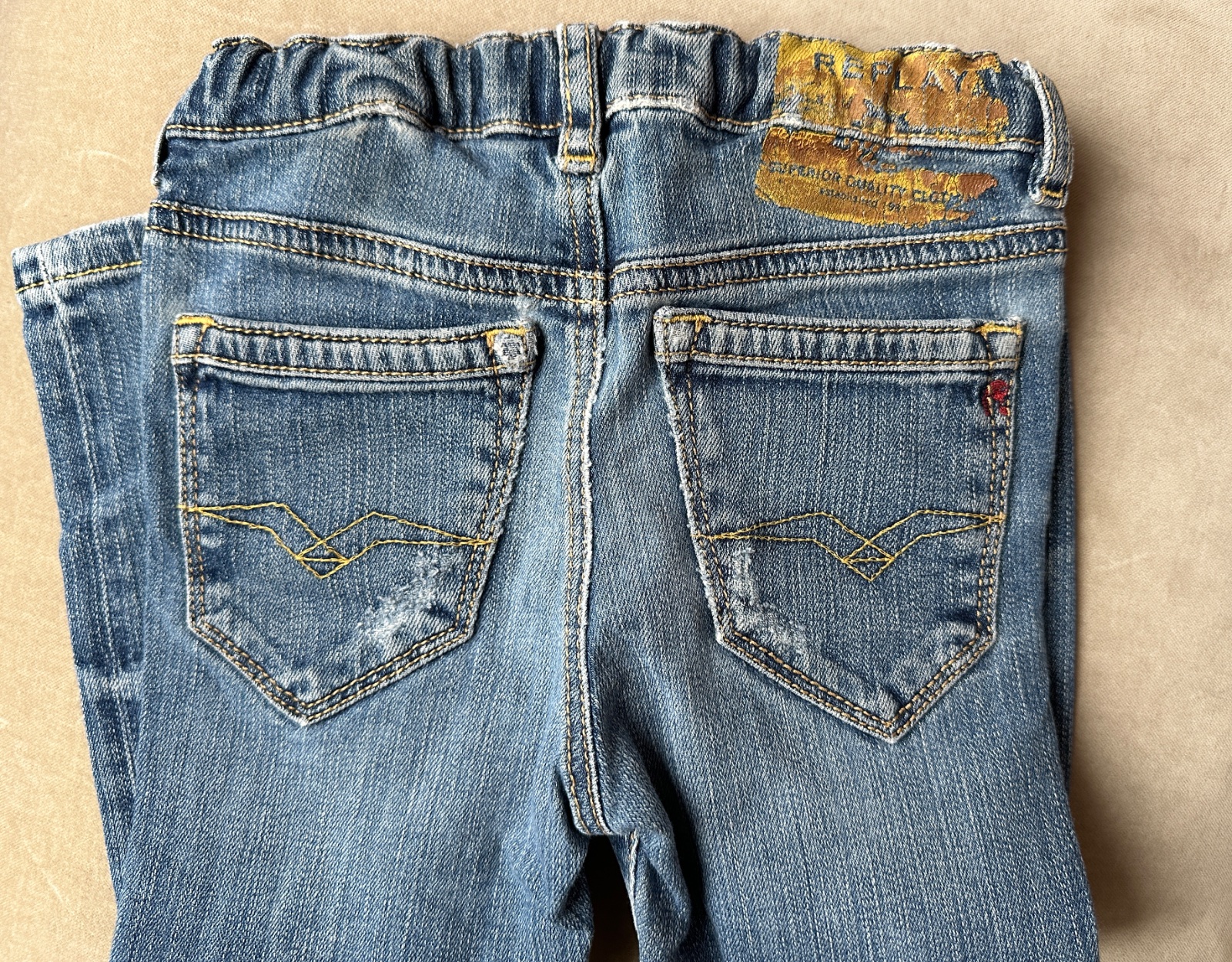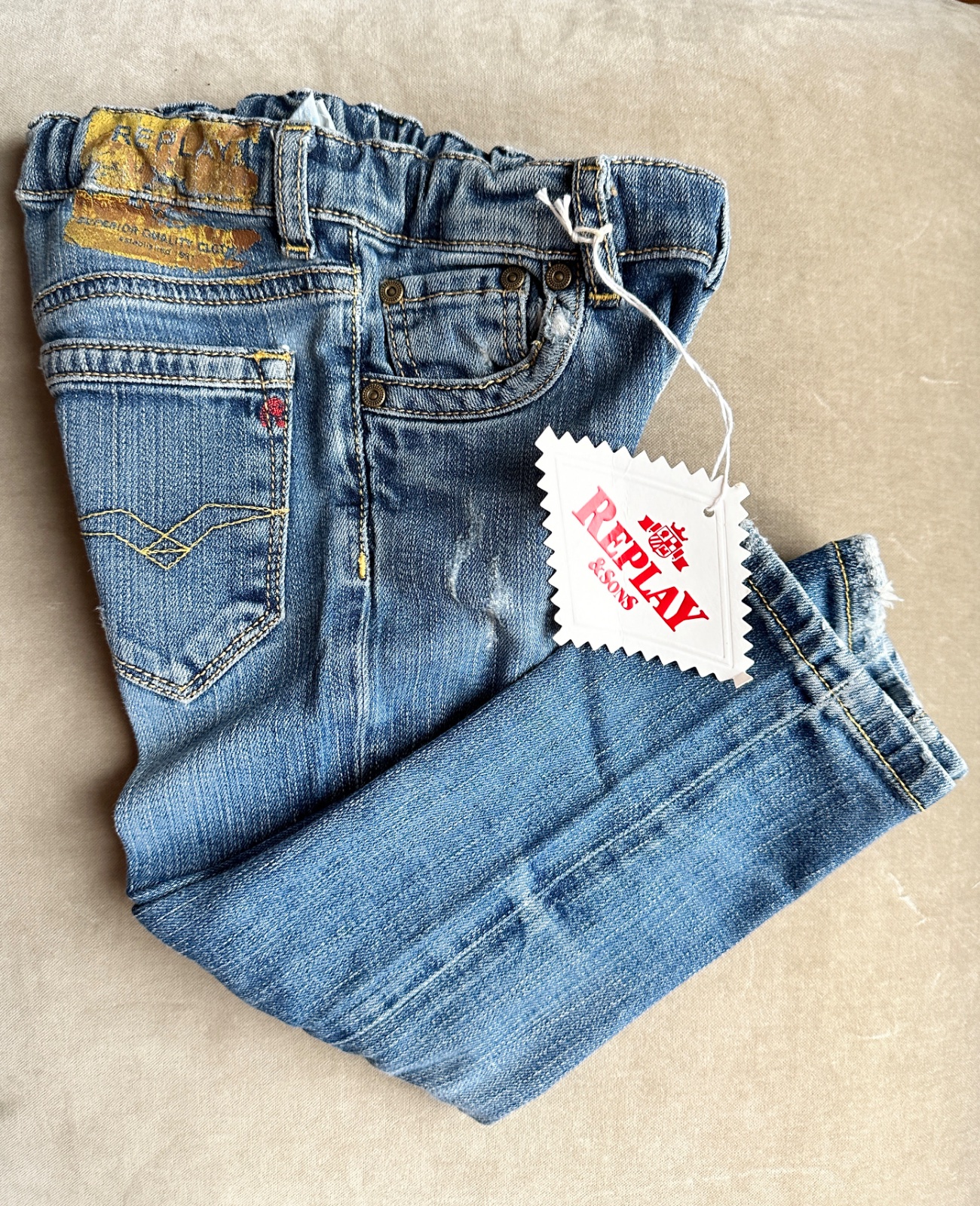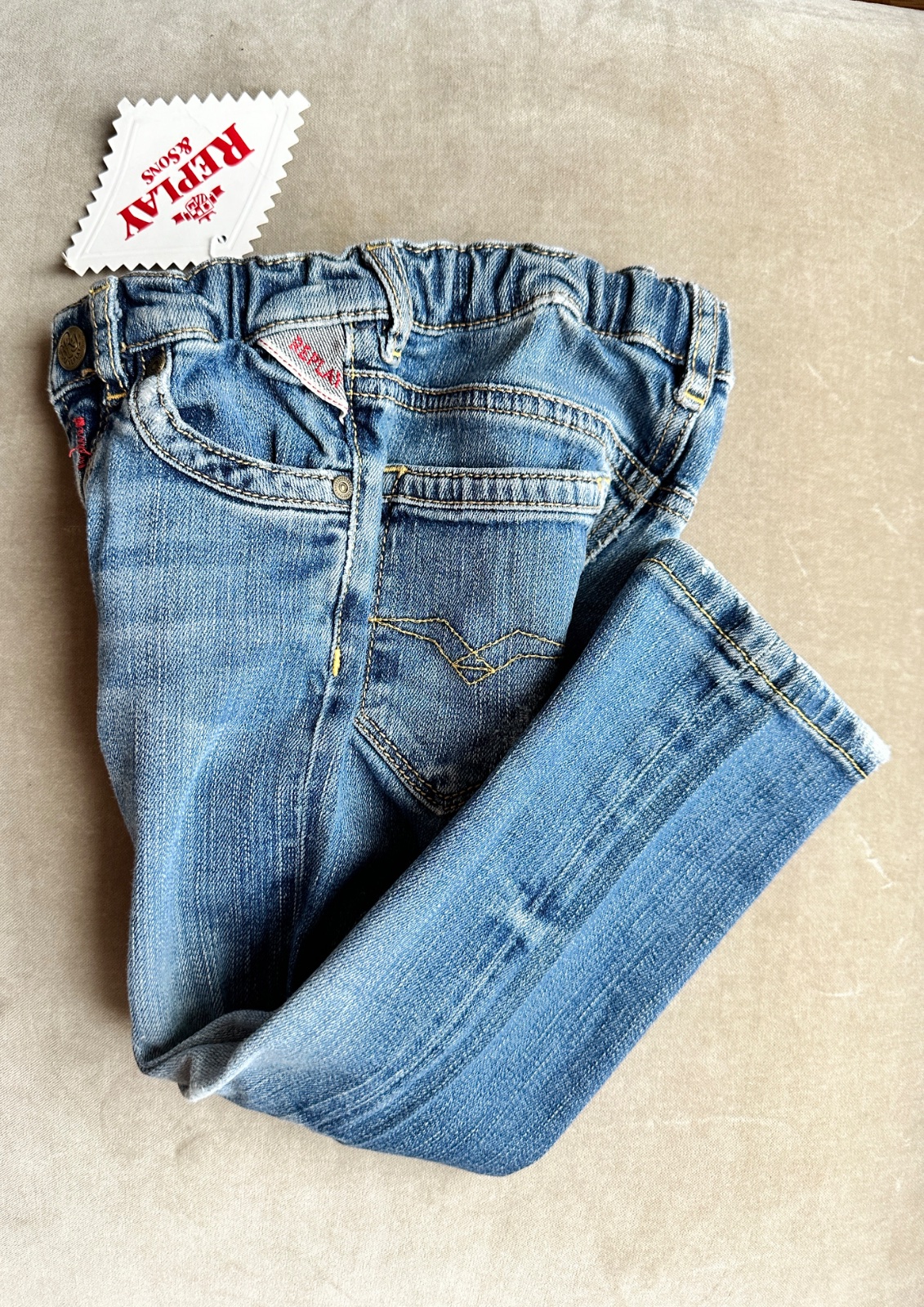 Super riflíky značky Replay, ponosené, ošúchané kolienka, sú ale podlepené. V páse je uťahovacia guma. Uvedená veľkosť 24 mesiacov 92 cm. 98% bavlna, 2% elastan. Darujem k nákupu, na donosenie alebo samostatne 5 Eur.