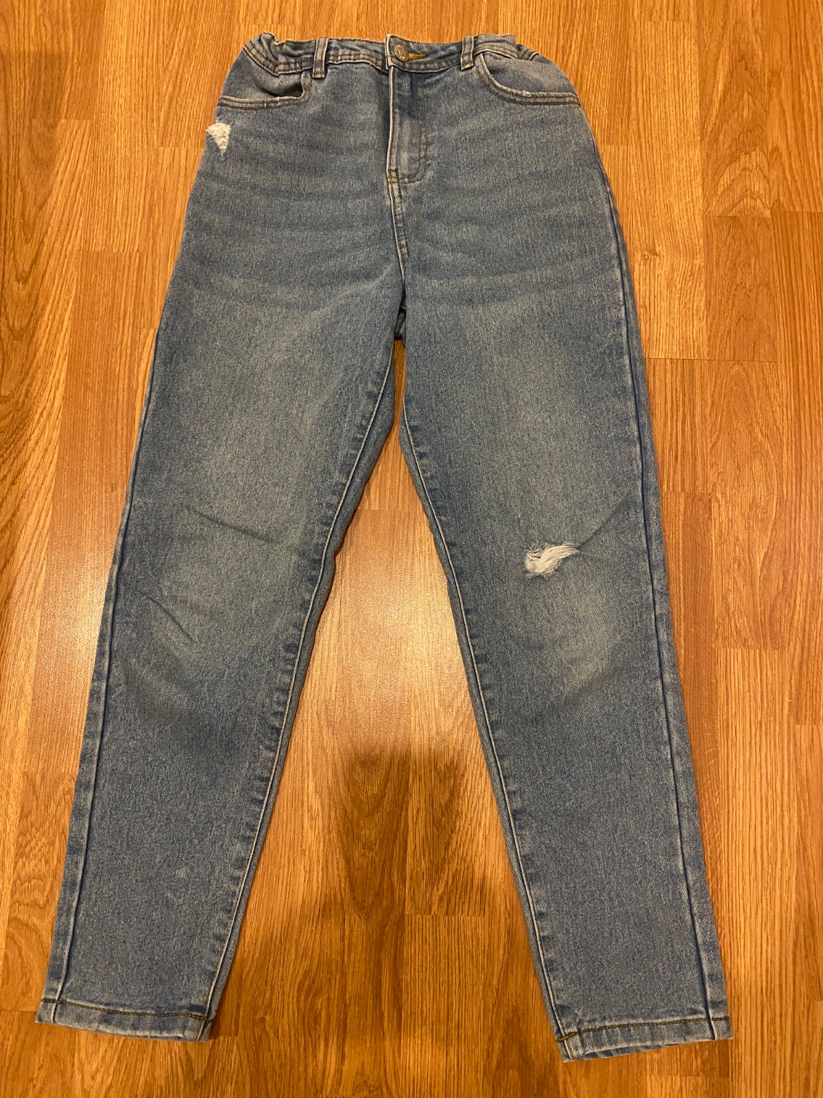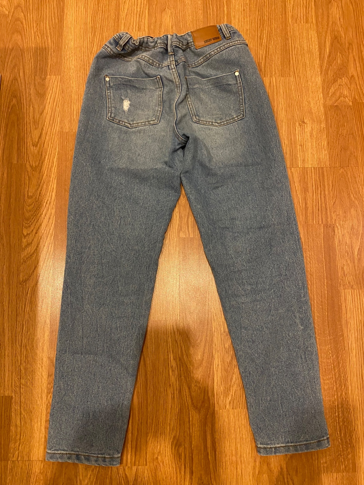 Nosené dievčenské rifle. Pás 68cm ( je tam aj gumičku na stiahnutie), boky 94cm, dľžka 88 cm.