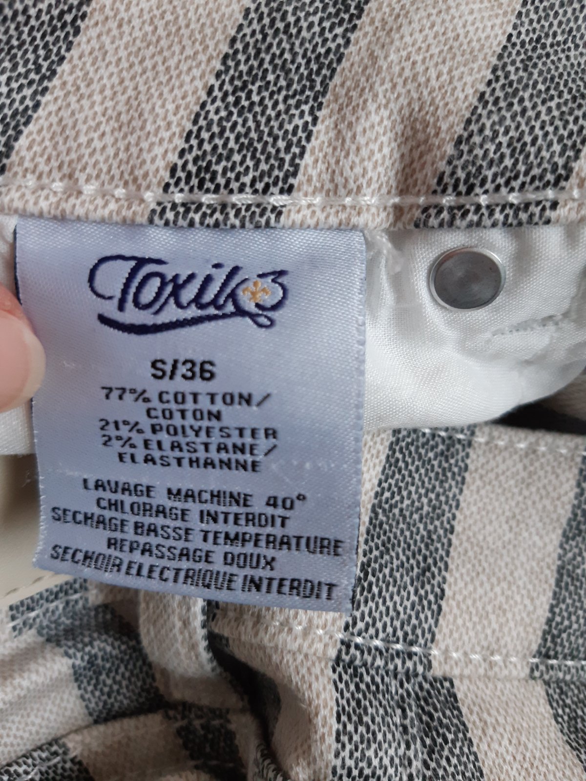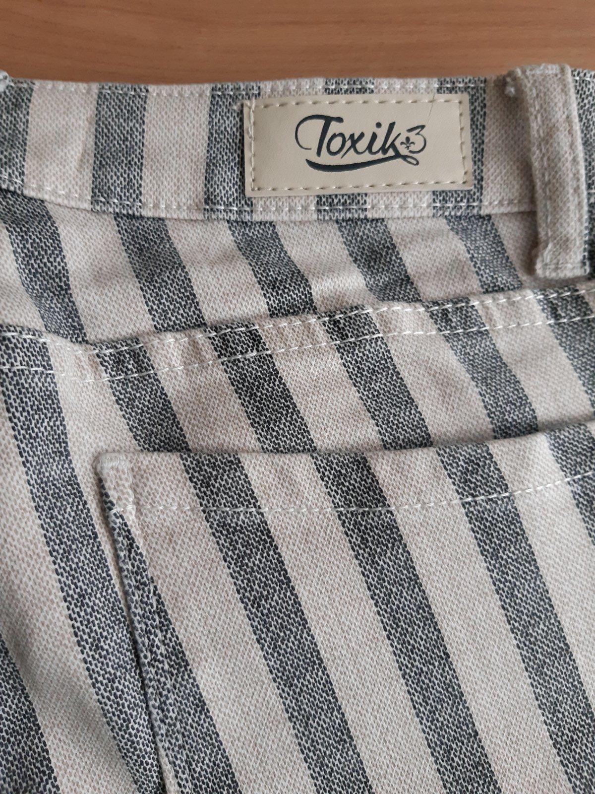 Predám pásikavé nohavice, kvalitná značka Toxik+3, veľ. 36/S, elastické, cena 3,-€