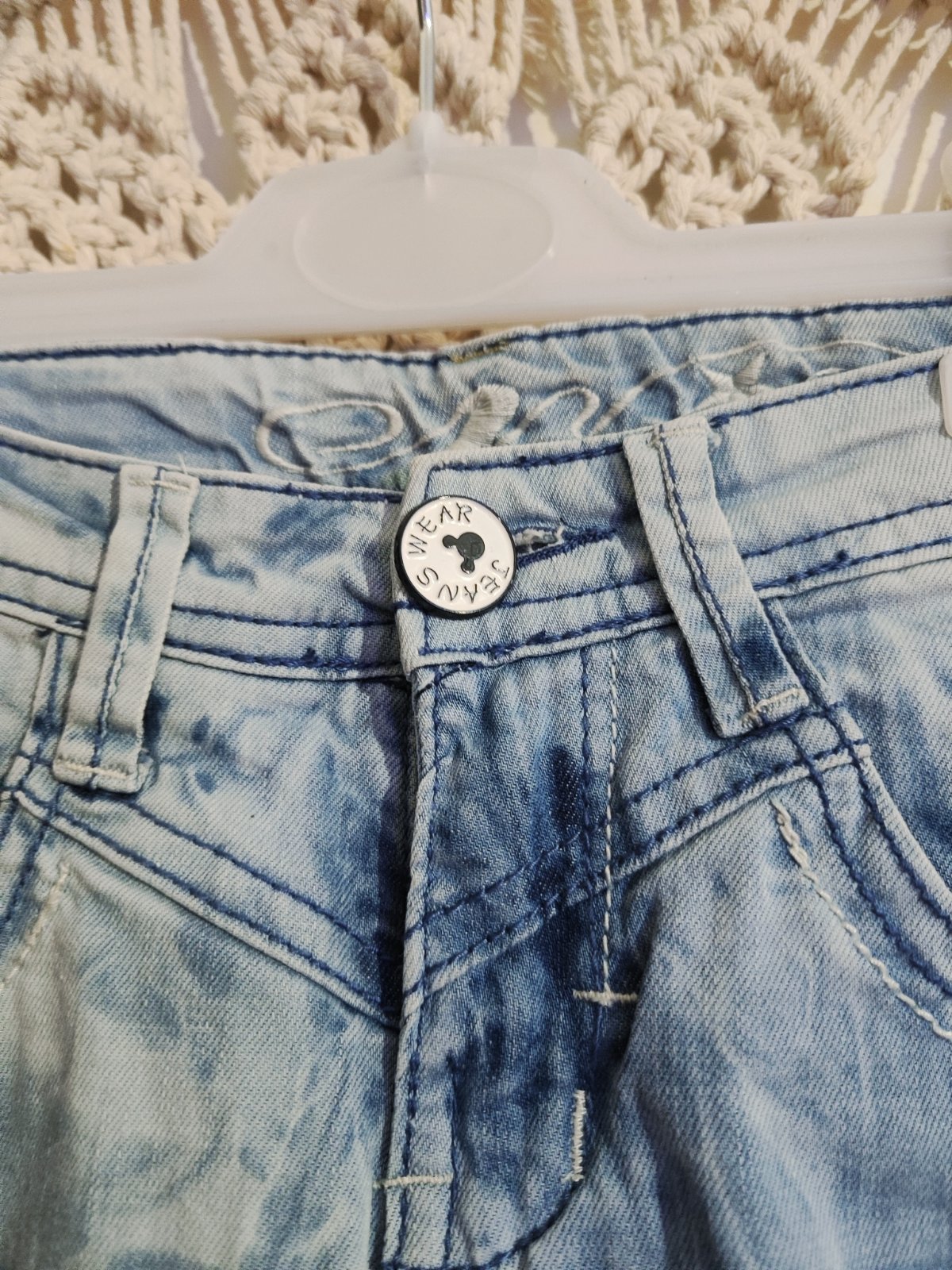 elastické rifle, vyšúchaný vzhlad, velmi pekné len na pravom kolene asi 1cm dierka- dalo by sa presit nazehlovackou. rozmery. dlzka 67, pás 2x 27 a viac. je tam nastavitelna gumicka. inac pekne- uz...