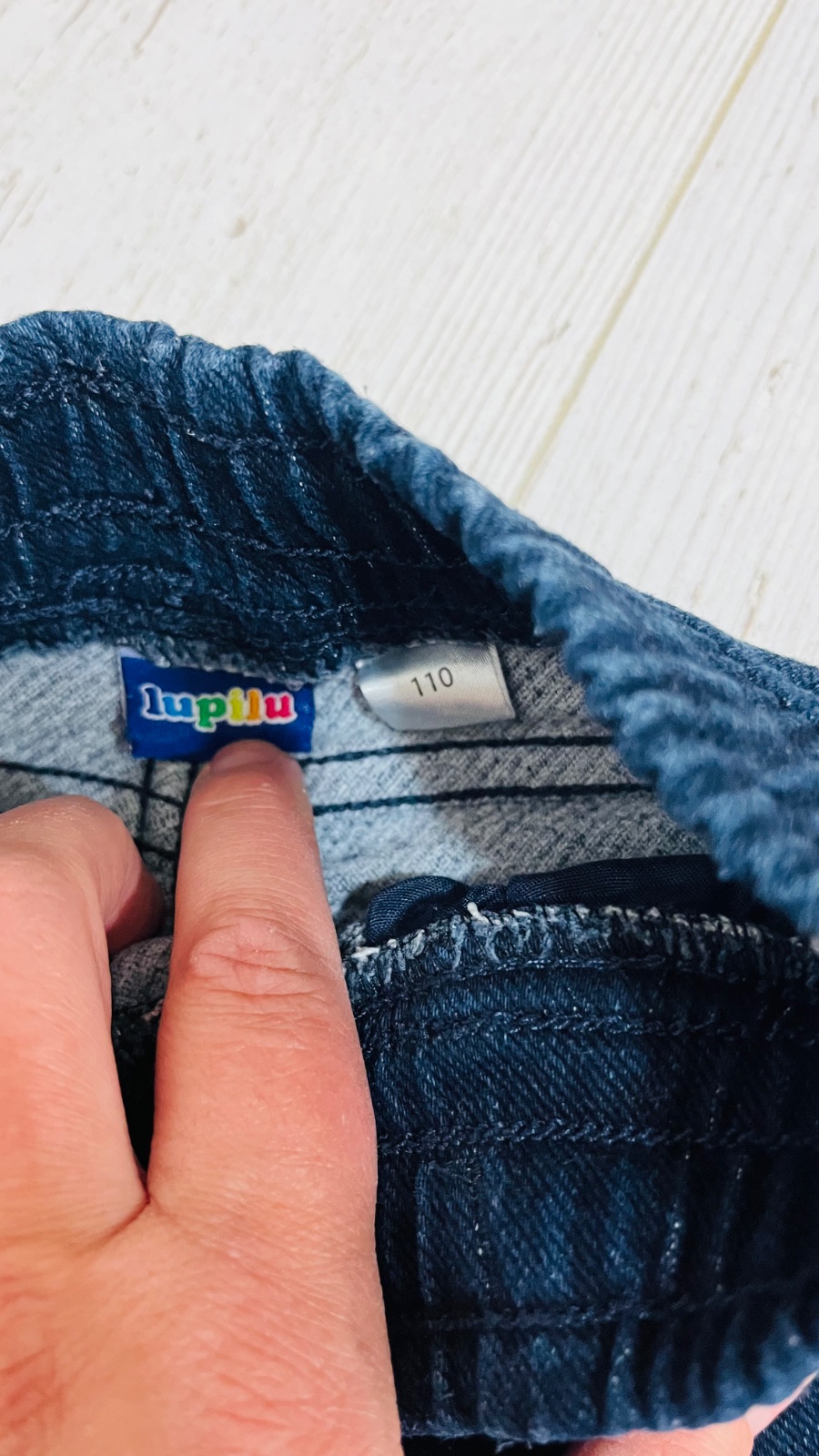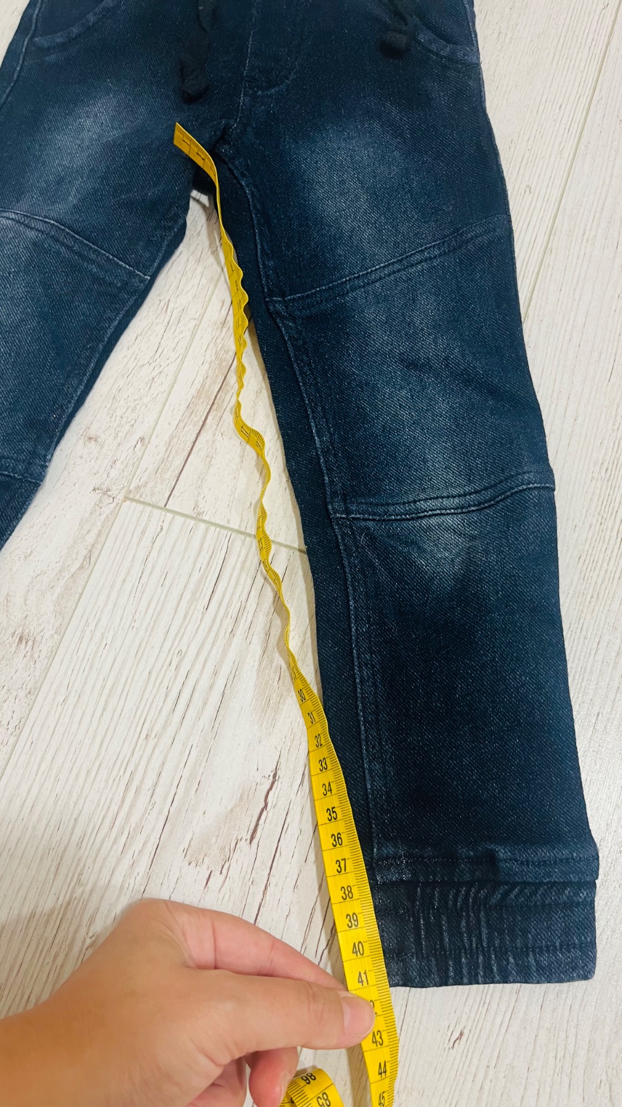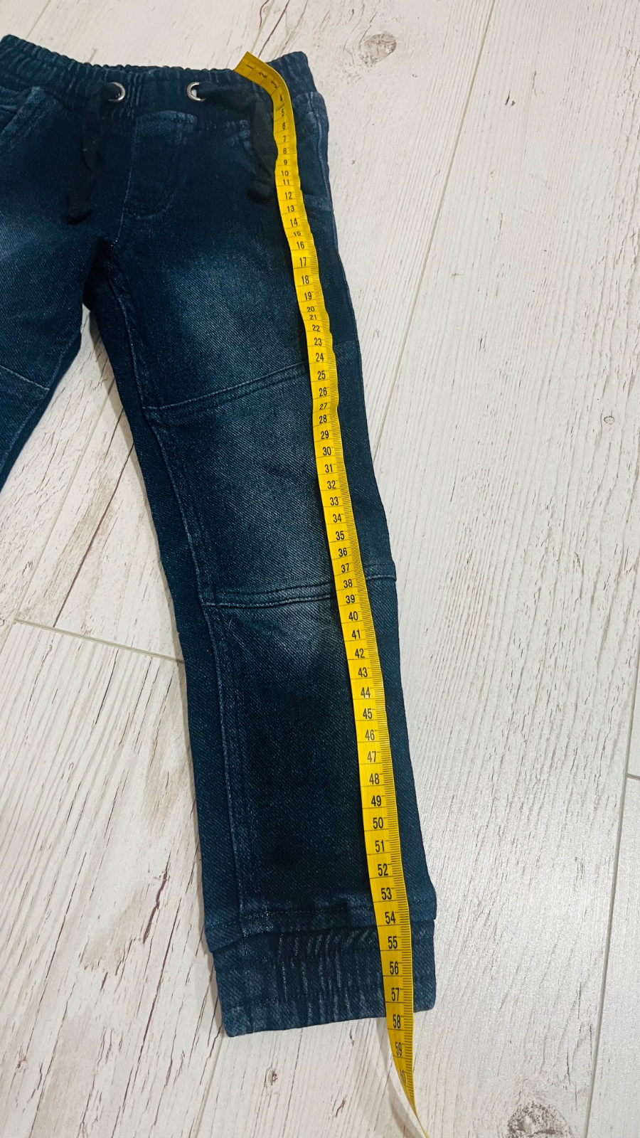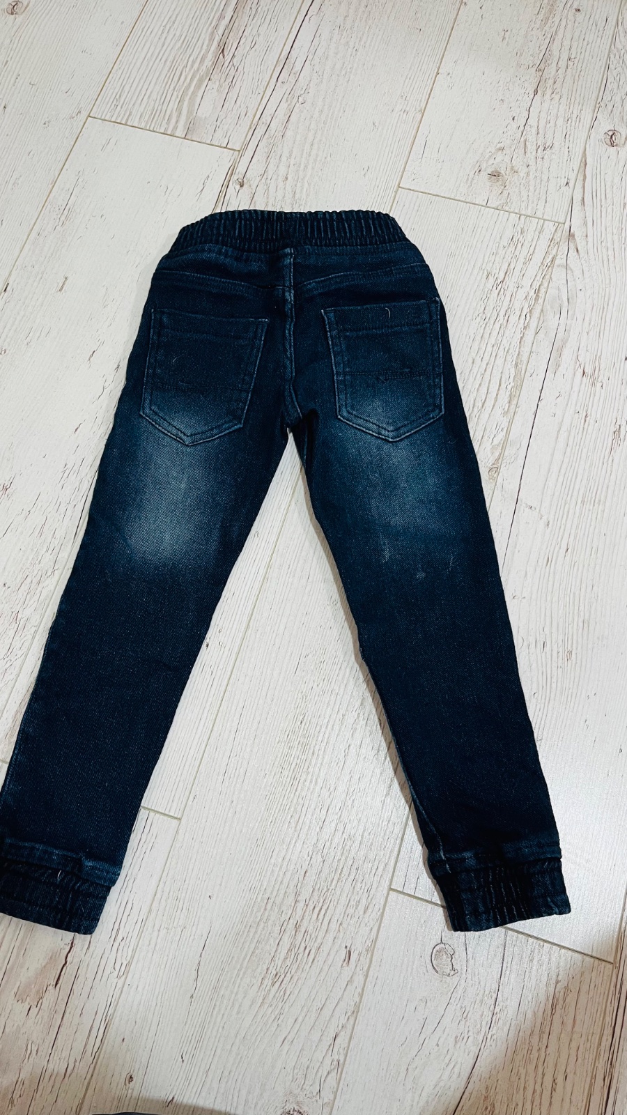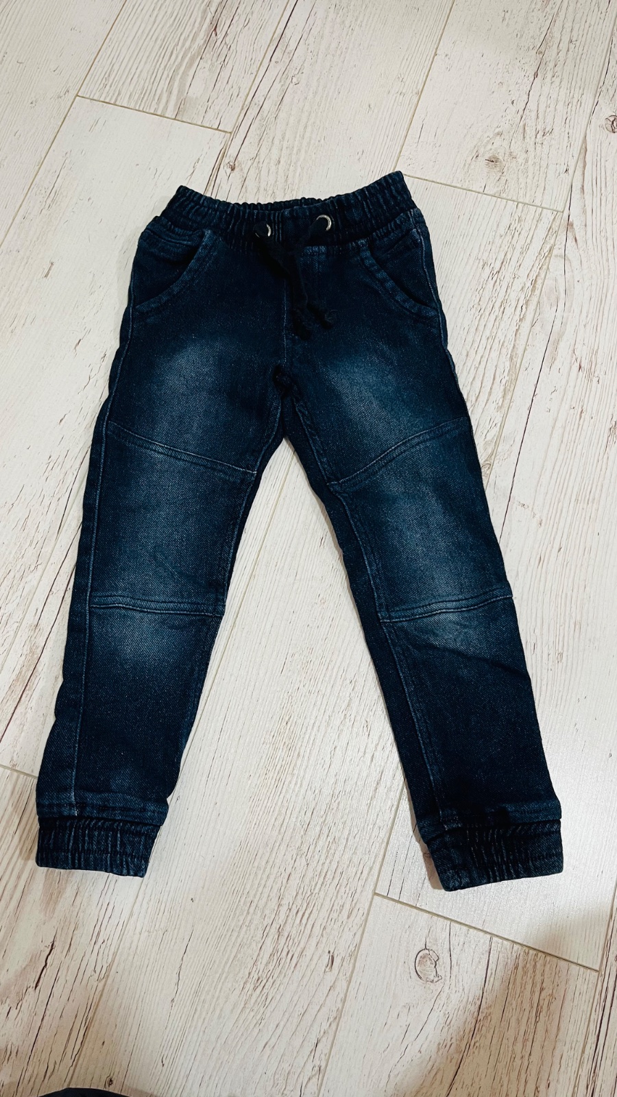 Džínsové tepláky po jednom dieťati v TOP stave. Píše veľkosť 116, ale skôr by som povedala 110. Hlavne na dĺžku. Farba je skôr taká ako na poslednej fotke, tmavšie modrá, veľmi pekná. Nepodarilo sa...