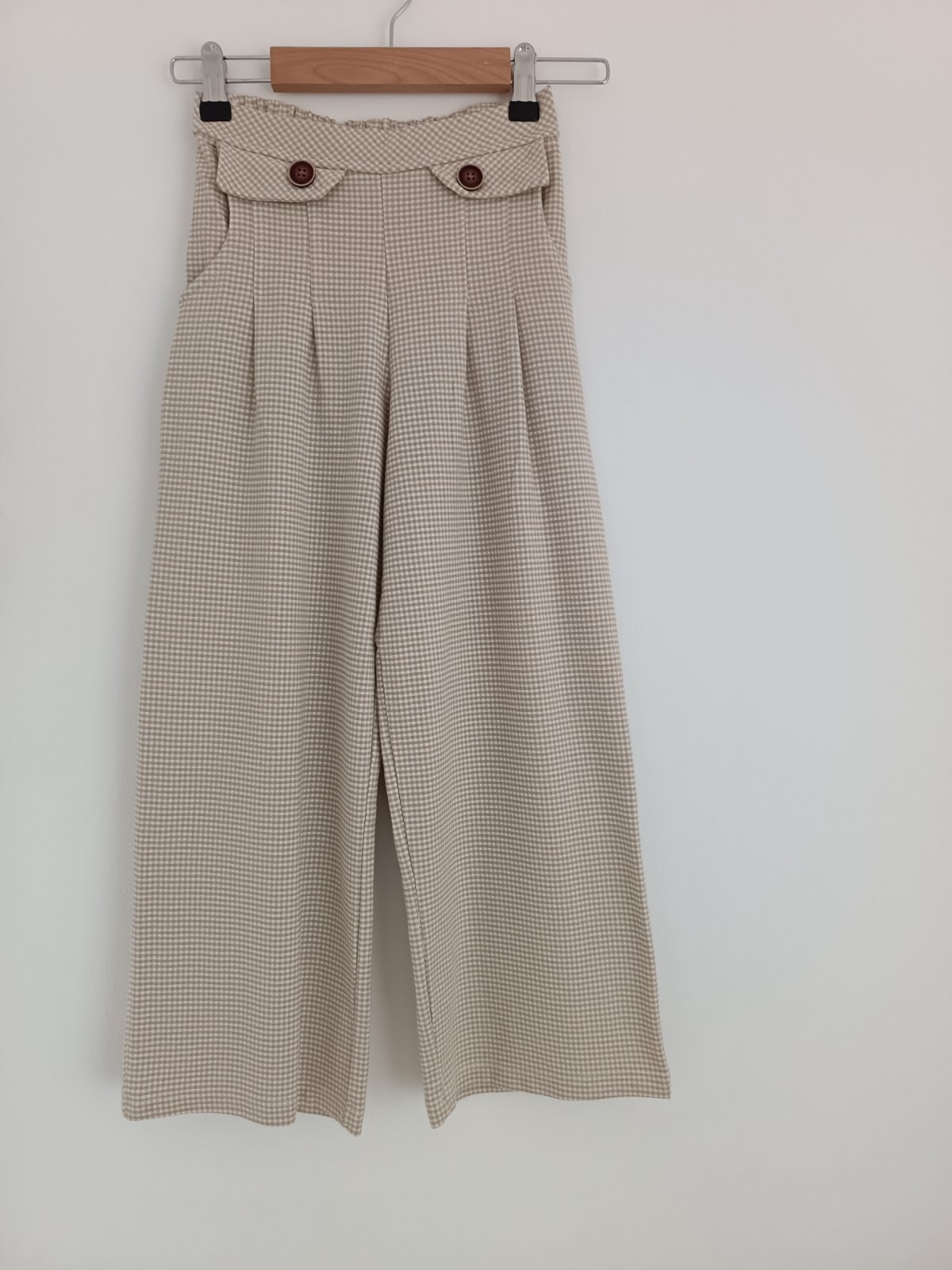 Široké nohavice, v páse zo zadnej strany gumička, z predu dva funkčné vrecká, z predu prešité, krásne sedia na postave,bez poškodenia,