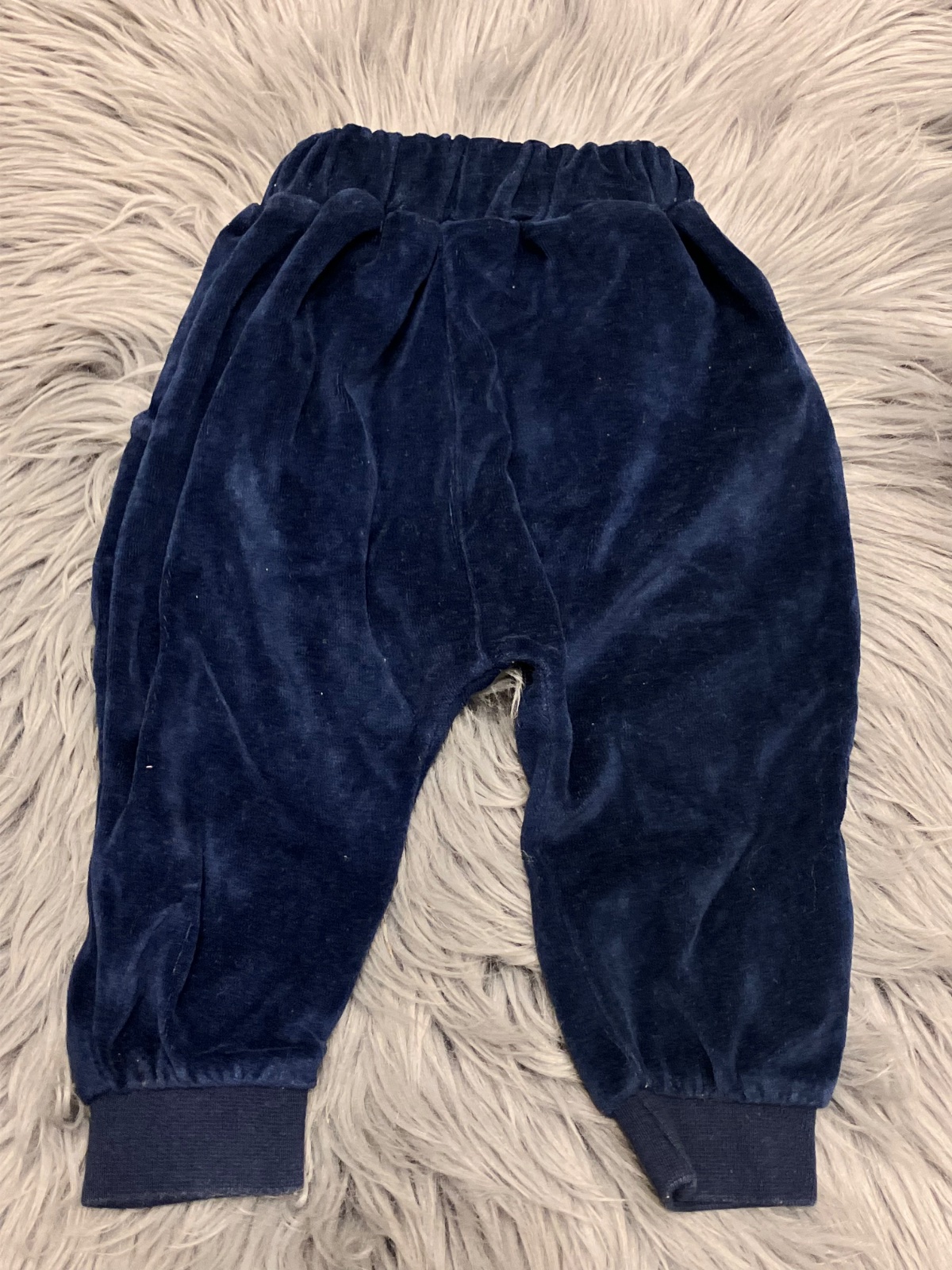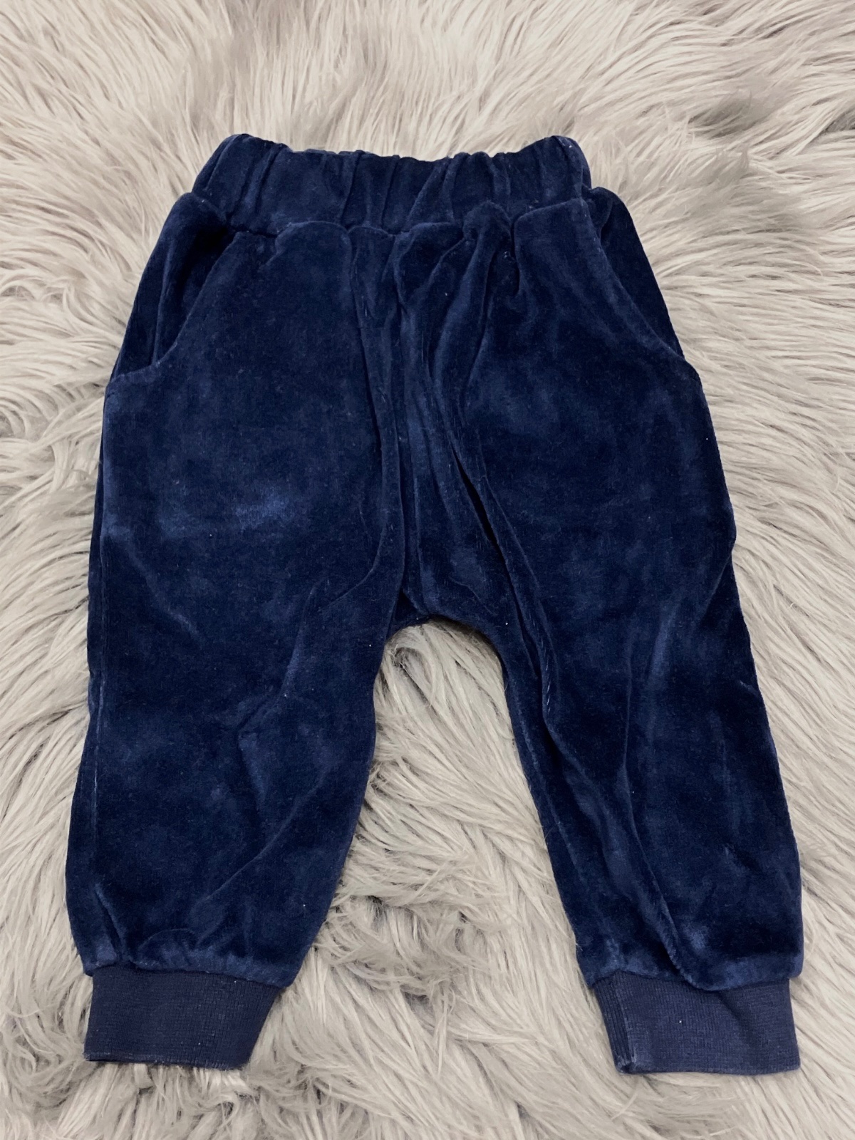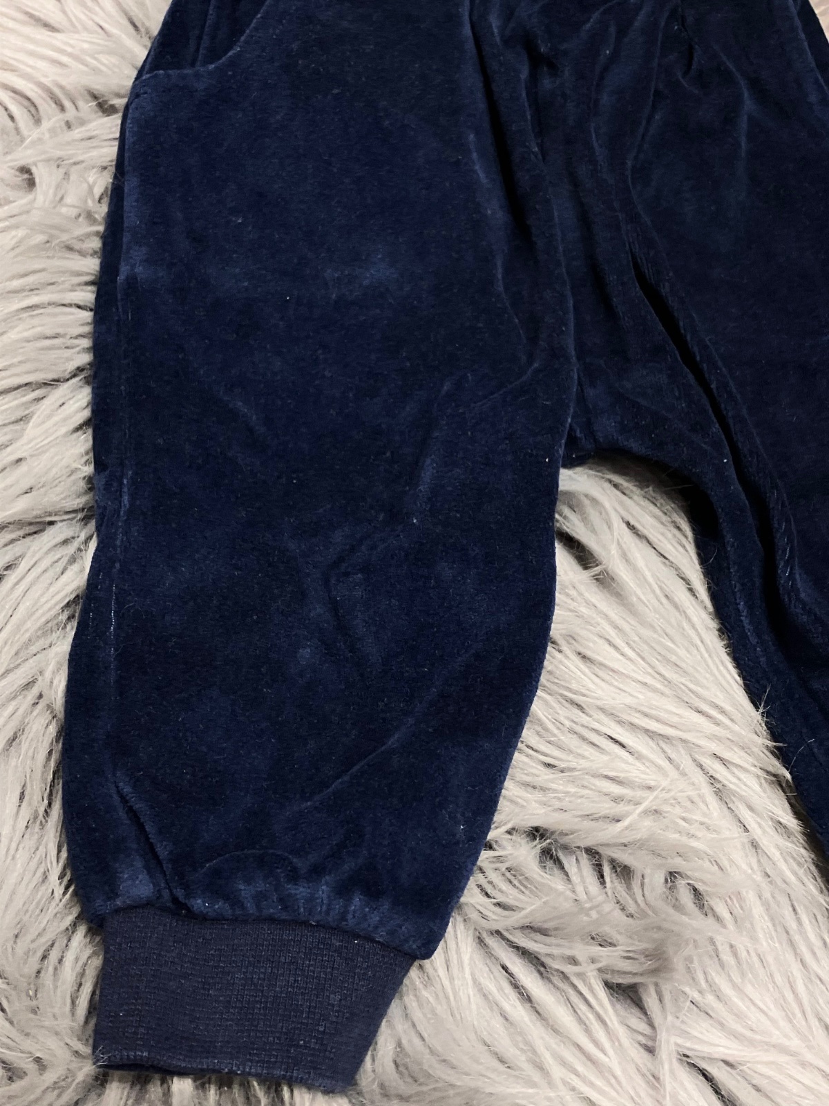 Chlapčenské tmavomodré tepláky, zamatové, hrubé, pás na gumu, dve bočné vrecká, veľkosť cca 74.