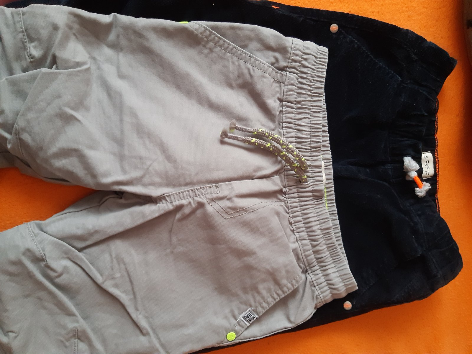 Hrubšie, suprové, vzadu guma, vpredu pevný pás, ale je tam aj šnúrka na stiahnutie, v prípade potreby. Dám k nim zadarmo zelený pulovrík, ten čo mám oblečený. Pár minižmoliek, ale poslúži +pošta