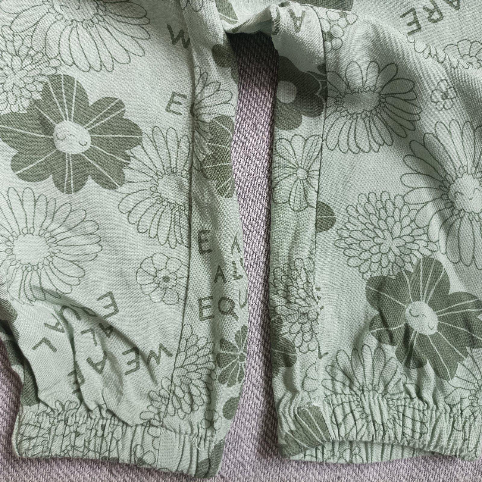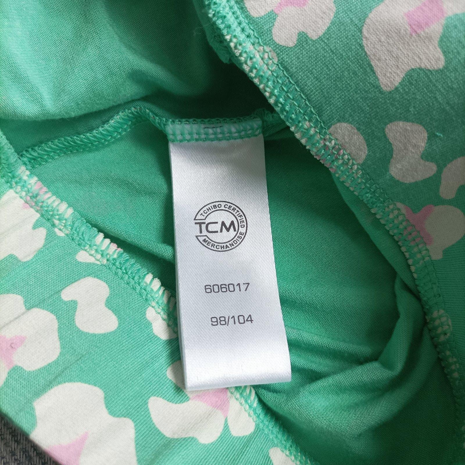 Zelene s ružovými kvietkami Tchibo, písaná veľkosť 98/104, ale sú omnoho vacsie. Dĺžka 60 cm, od rozkroku 40,5 cm, pás v kľude 27 cm, v páse široká guma aj šnúrka na stiahnutie, ukončené tenkou gumičkou, 2 vrecká, elastické, 95 %viskóza, 5% elastan.