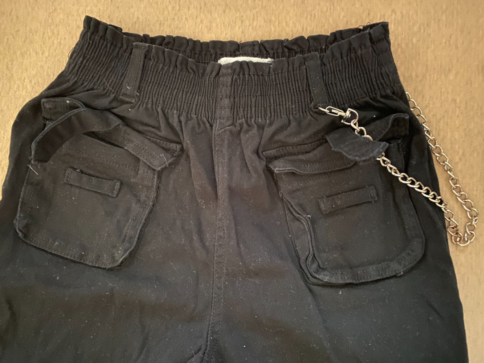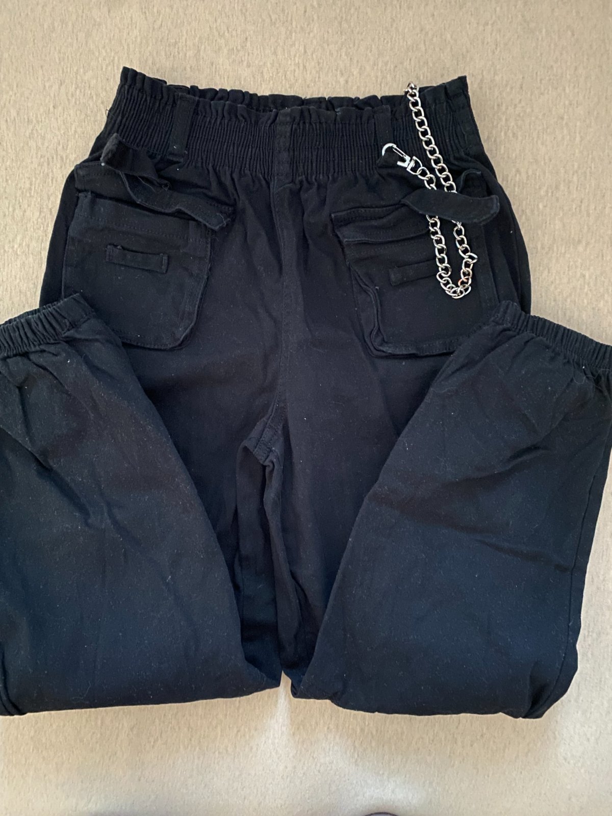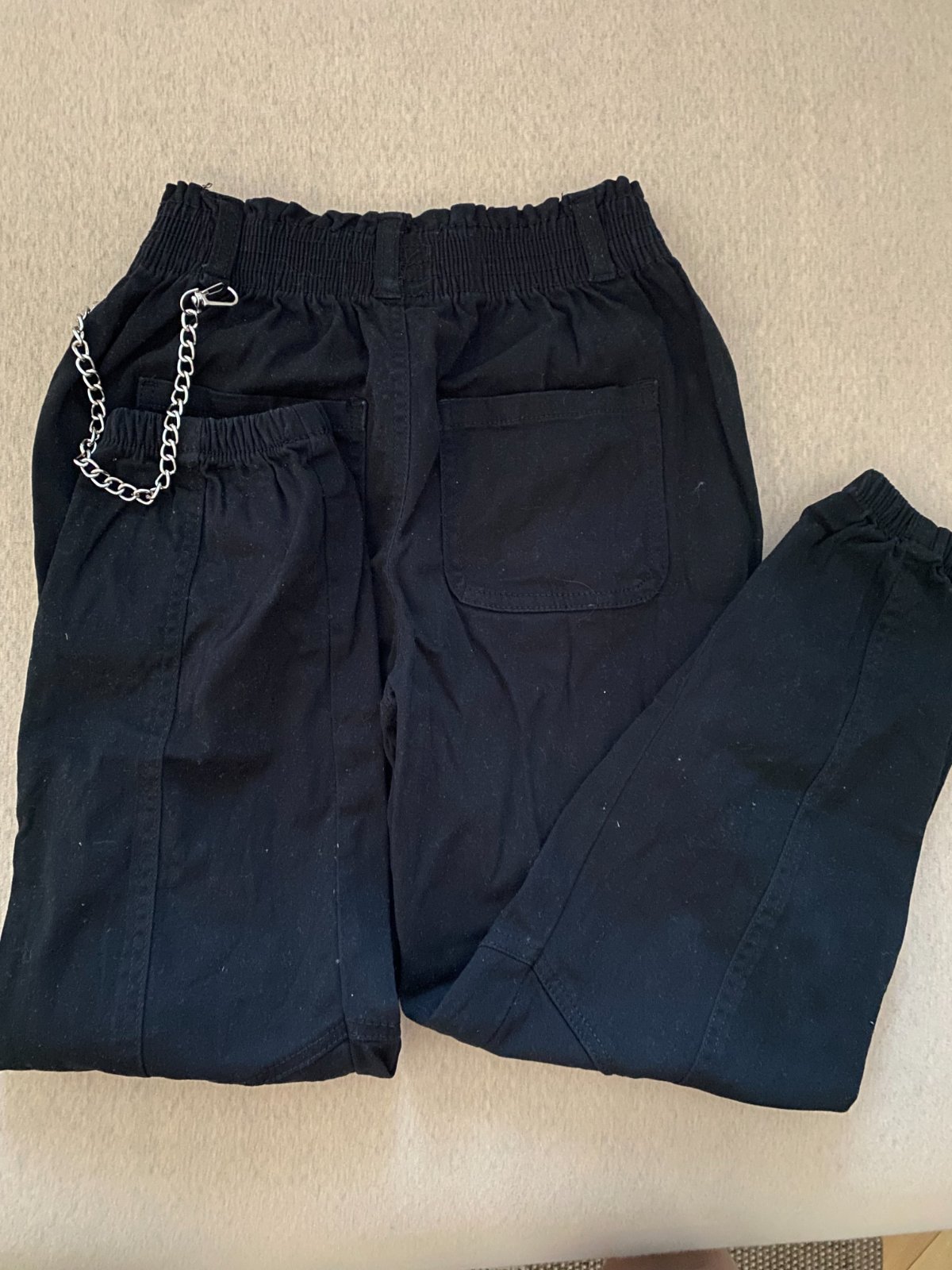Dlhé nohavice voľného strihu s gumičkami na spodnom okraji nohavíc, aj v páse, s prednými aj zadnými vreckami, zdobené retiazkou.