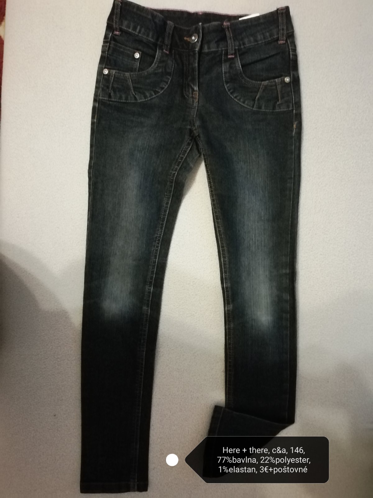 Predám malo nosené dievčenské tmavomodré rifle zn.C&A, Here +there 146, na prednom dieli zaujímavo riešené vrecká, vyšité aplikácie na zadných vreckách aj páse.