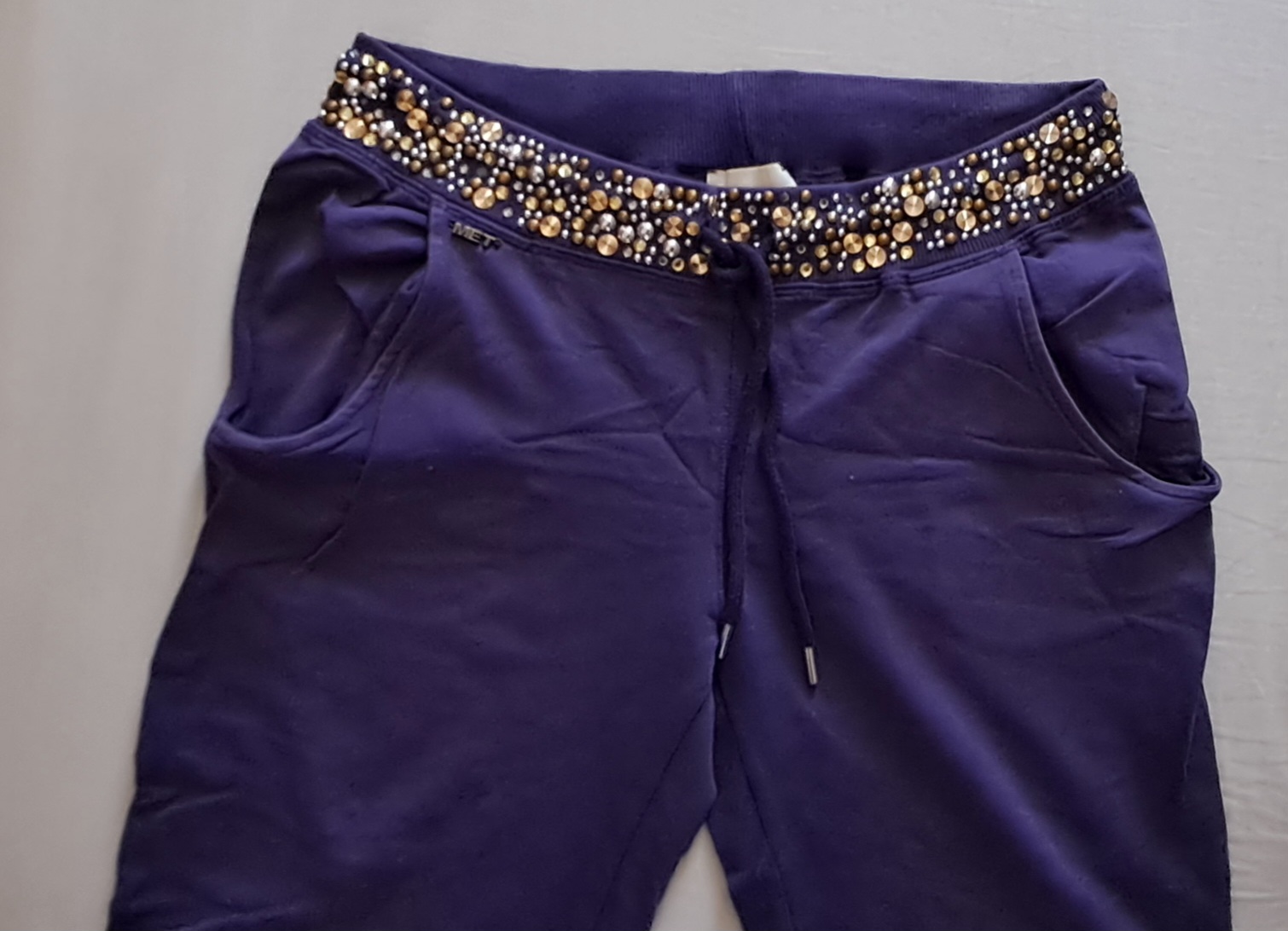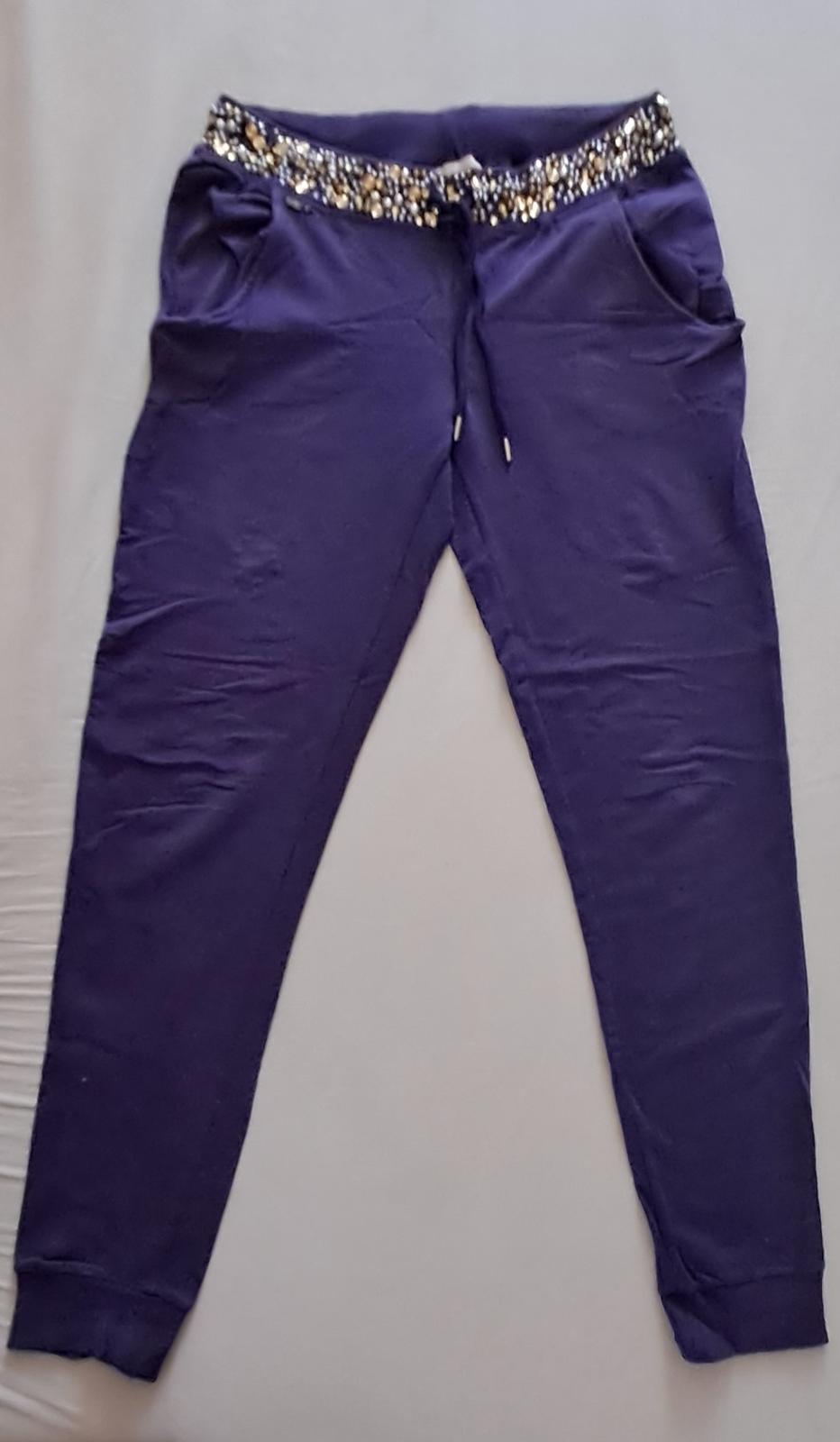 Obcas nosené fialové teplaky s trblietkami, miestami kamienky odpadli