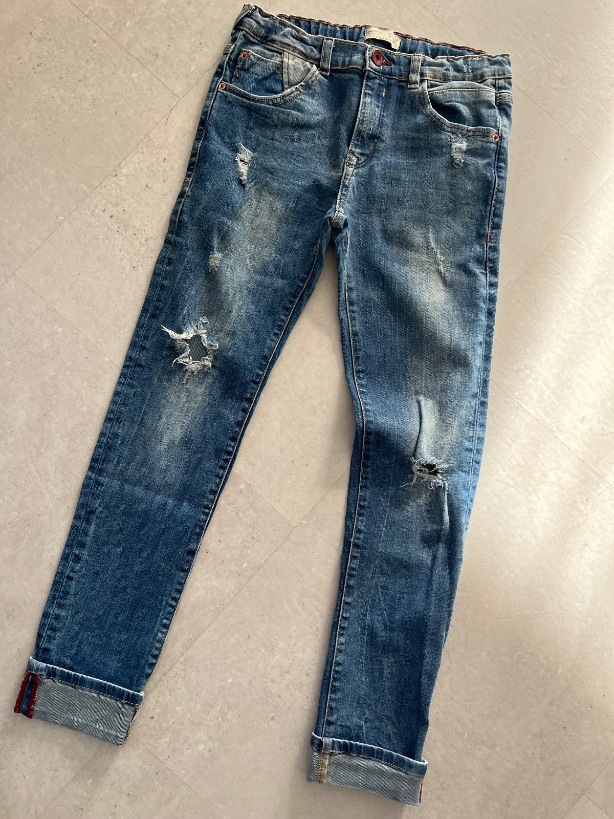 Nenosené rifle. Kupované v predstihu ale mali sme viaceré v tejto velkosti tak sa nevynosili. V.158/164 na vek okolo 13r. Rozmery pofotene. Strih skinny a riped, roztrhané. Cena 9,9e.