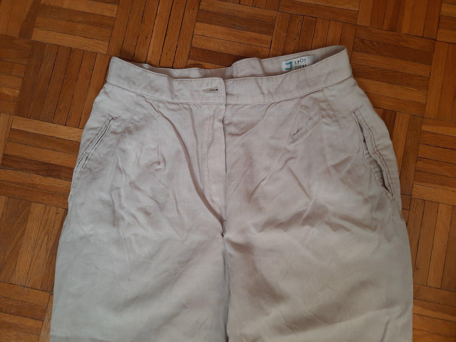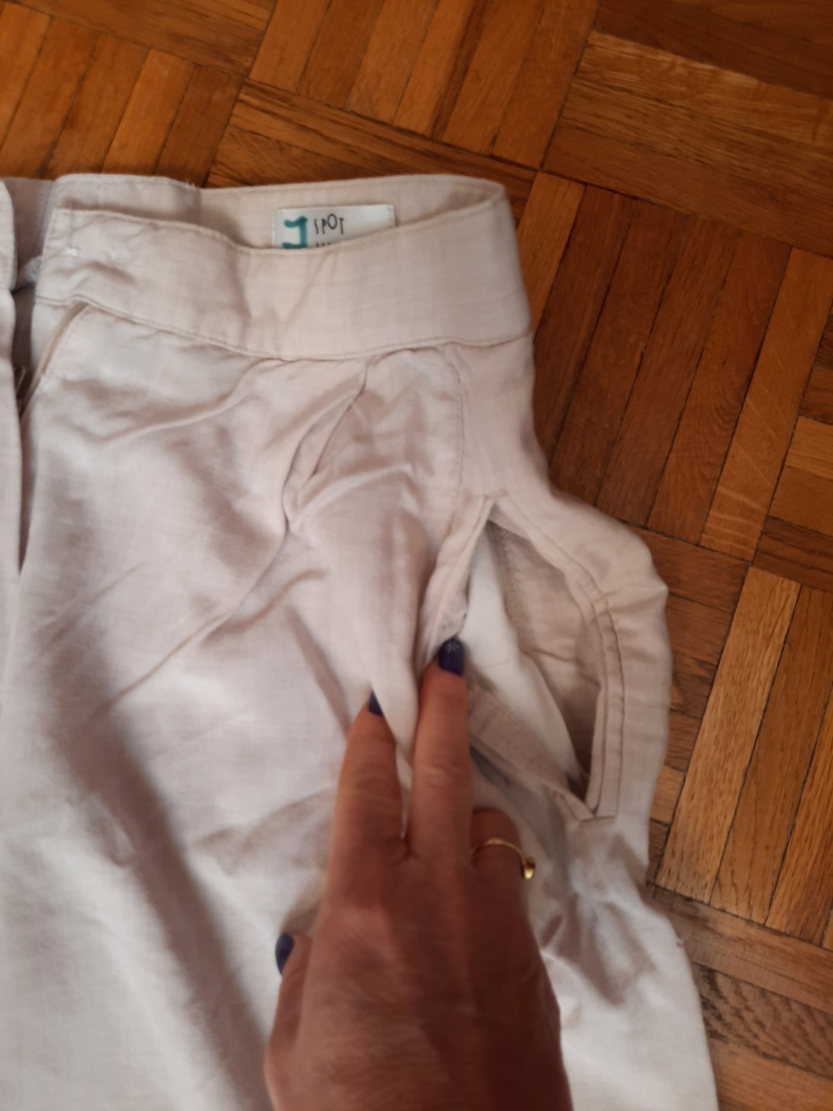 Super vzdušné, ľahučké nohavice z príjemného materiálu. Dole na sáre je malý rázporok, ale aj maličká dierka, čo však pri nosení nevidno. Iné poškodenia som nenašla. Na bokoch sú vačky. Sú aj trošku elastické.