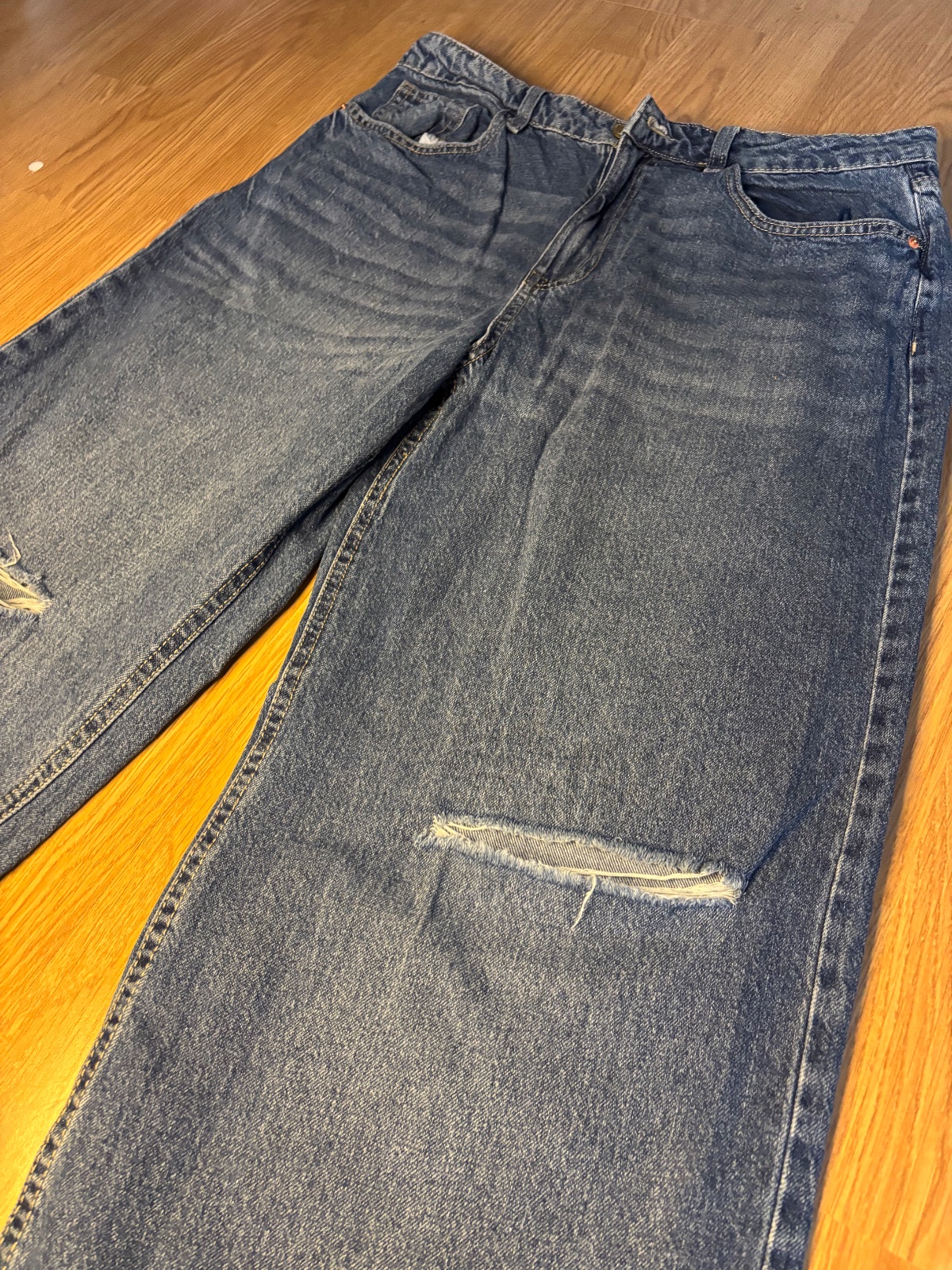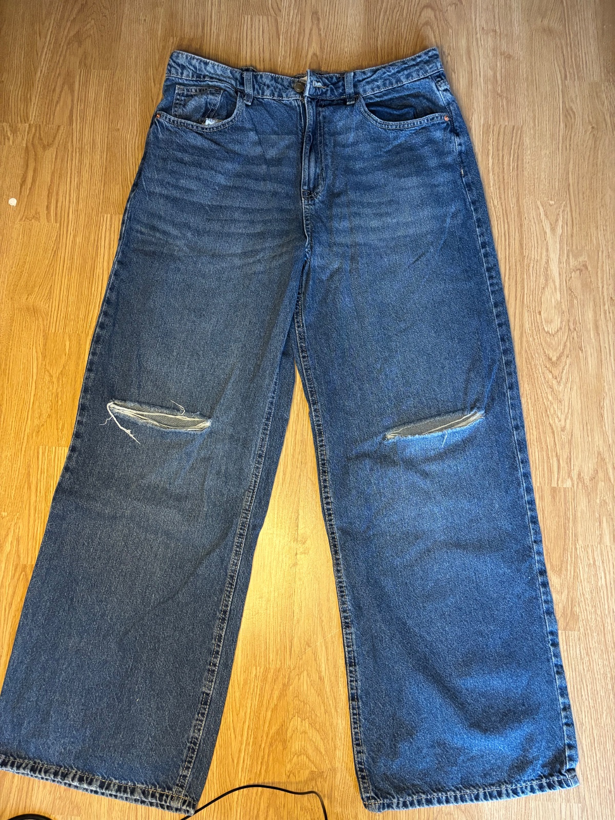 Perfektné pudlové rifle! Veľkosť L, ale kľudne aj do veľk. 44/XXL, sú elastické, treba sa riadiť mierami! Dĺžka - 89 cm, pás - 2x 43/52 cm, boky - 2x 57/65 cm, predný sed - 41 cm, zadný sed - 43 cm.