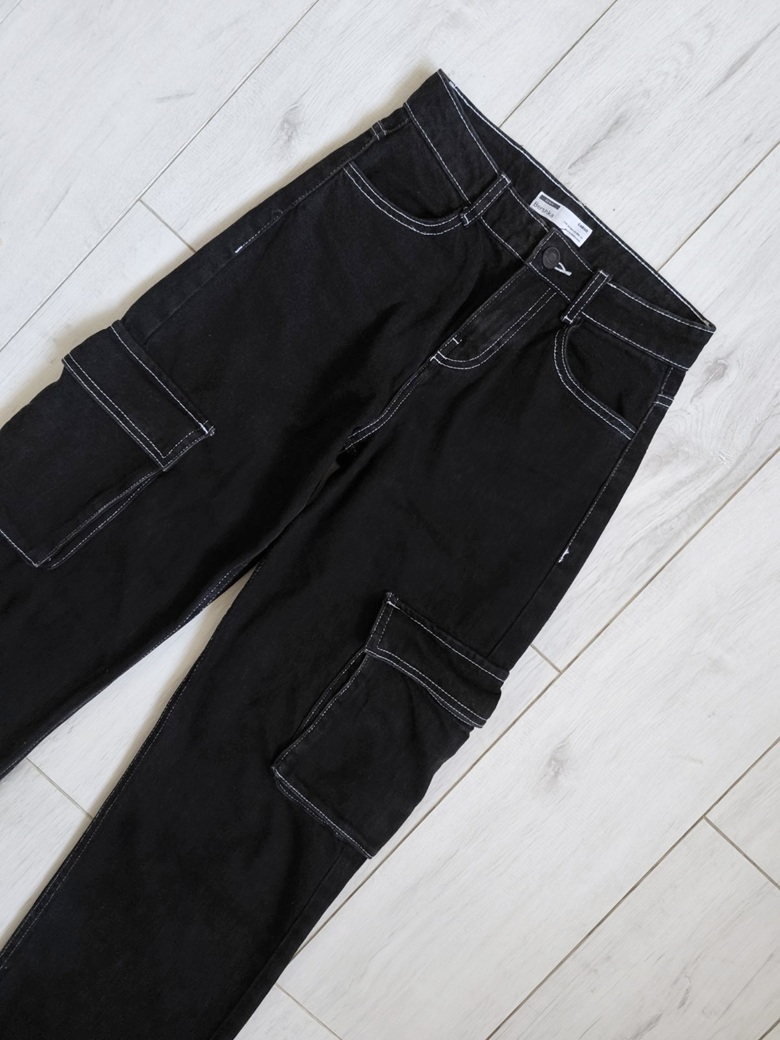 Ponúkam tieto Cargo jeansy zn. BERSHKA, čiernej farby s bielym prešívaním, s bočnými vreckami, v perfektnom stave ako nové, veľkosť 34.