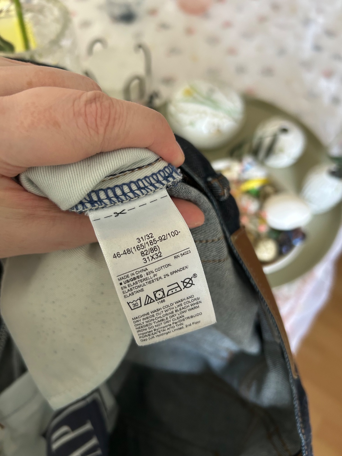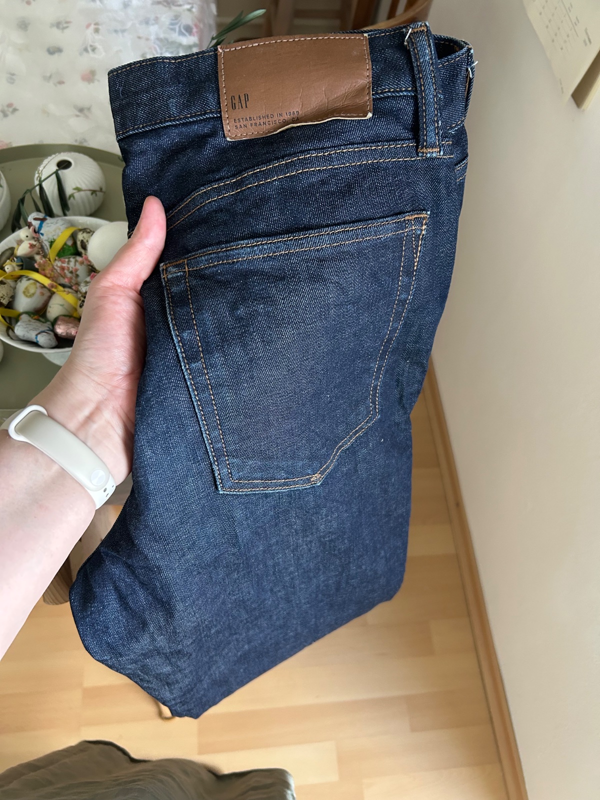 Nosene krátko , zmena na jednom kolene farby posledná fotografia , pevné, klasická farba , straight slim pre výšku a rozmery , zloženie ,pozri štítok , prispôsobia , dá sa aj skôr nosiť, farba ako na prvej fotografii skôr ešte tmavšia ,