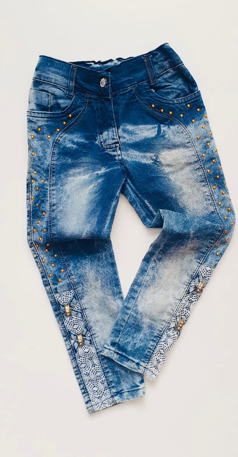 Rifle s kamienkami a krajkou zakúpené v zahraničí,veľkosť 5-6, sedia na veľkosť 104/110, treba sa riadiť dĺžkou, cd 59 cm, regulácia v páse, výborný stav.