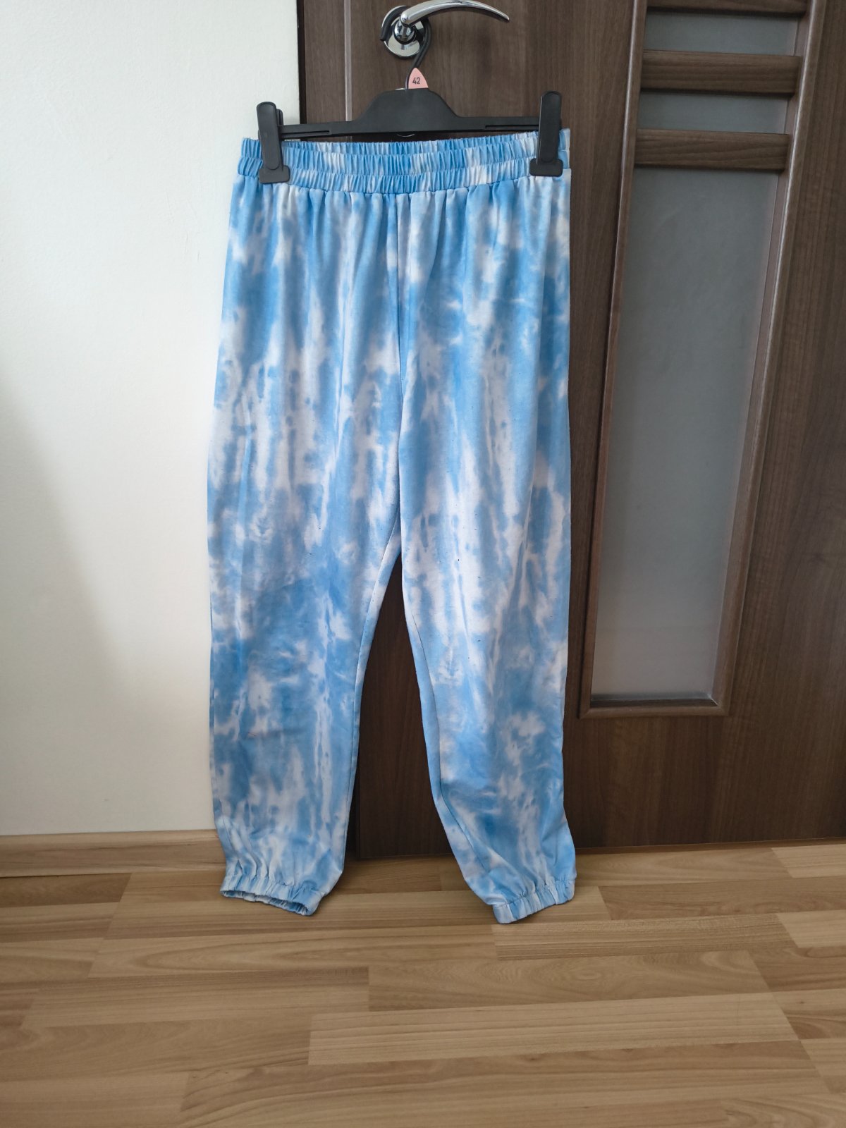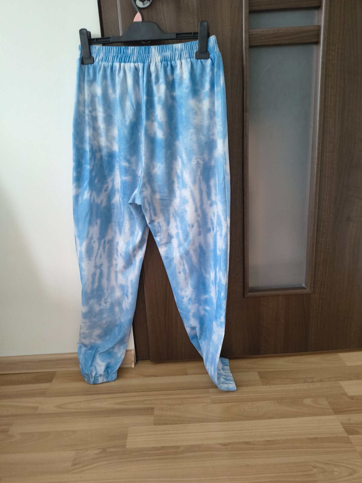 obr.č.1 - svetlučko modré v.L/XL - Velúrový vrúbkovaný materiál - 95%polyester, 5%elastan - pás na gumu aj šnúrku, vpredu 2funkčné vrecká, v spodnej časti sú tepláčiky zúžené - dl.99cm. (262g) obr....