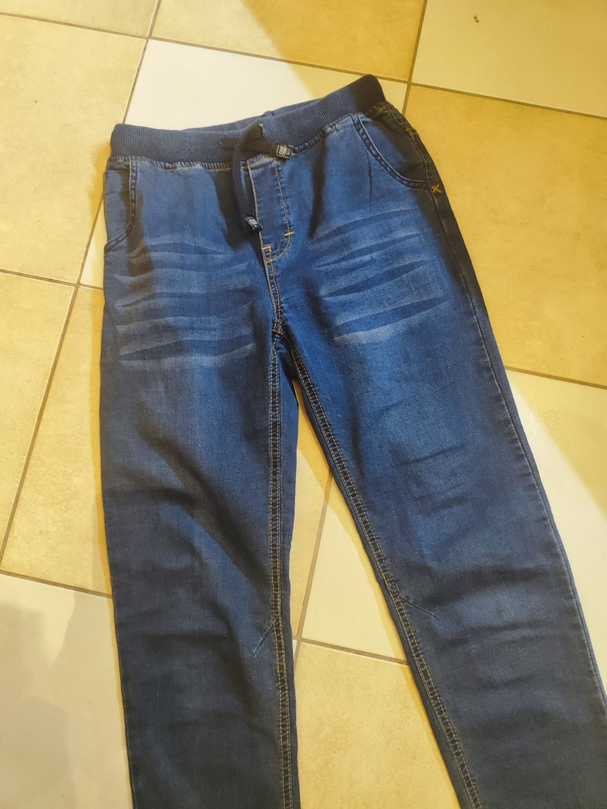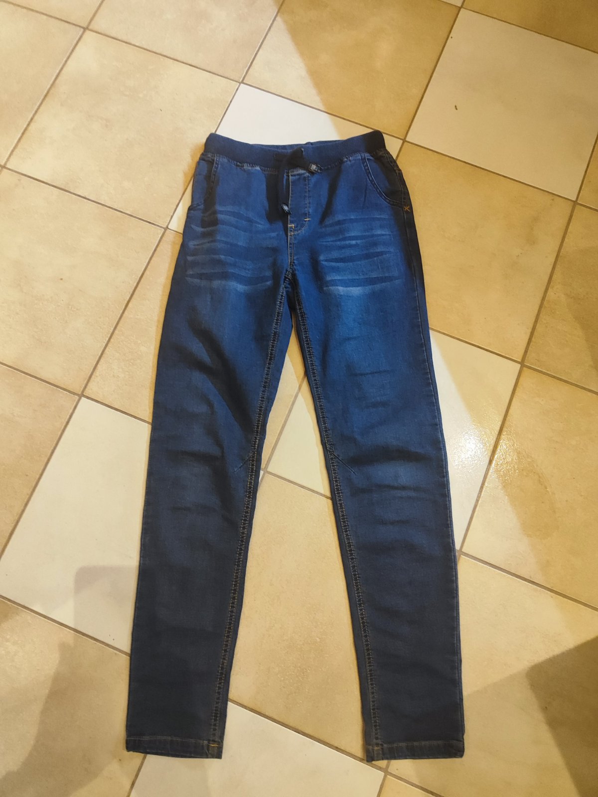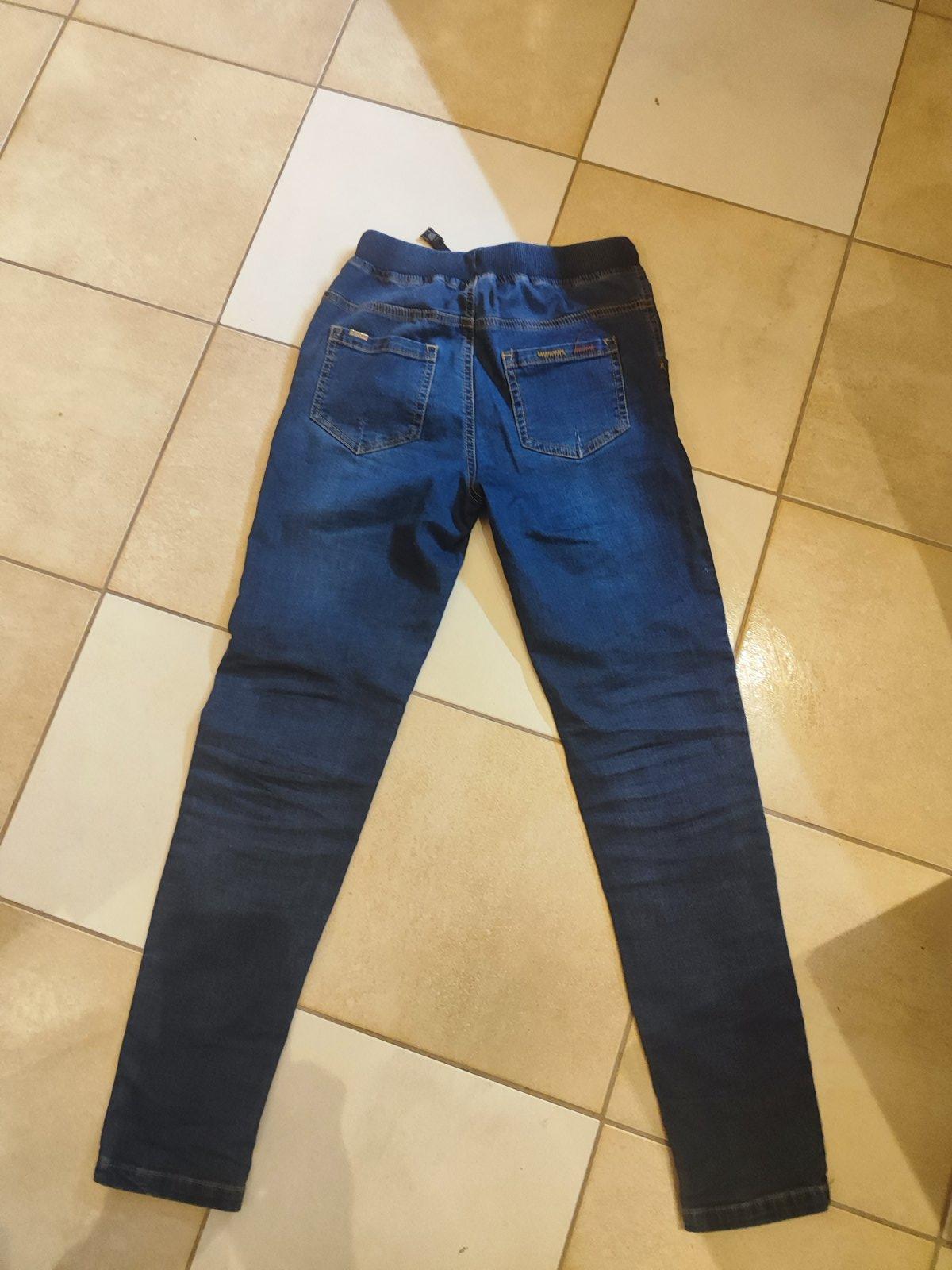 predám pekné nepoškodené jemne strecove rifle, pri vreckách s vysuchanym motívom,celková dĺžka cca 92cm.,pás v kľude na gumu má cca 30cm.