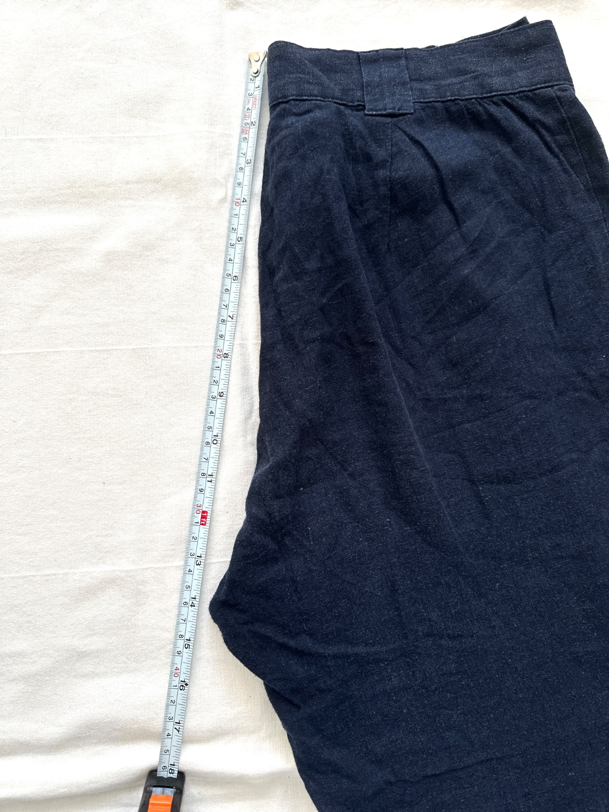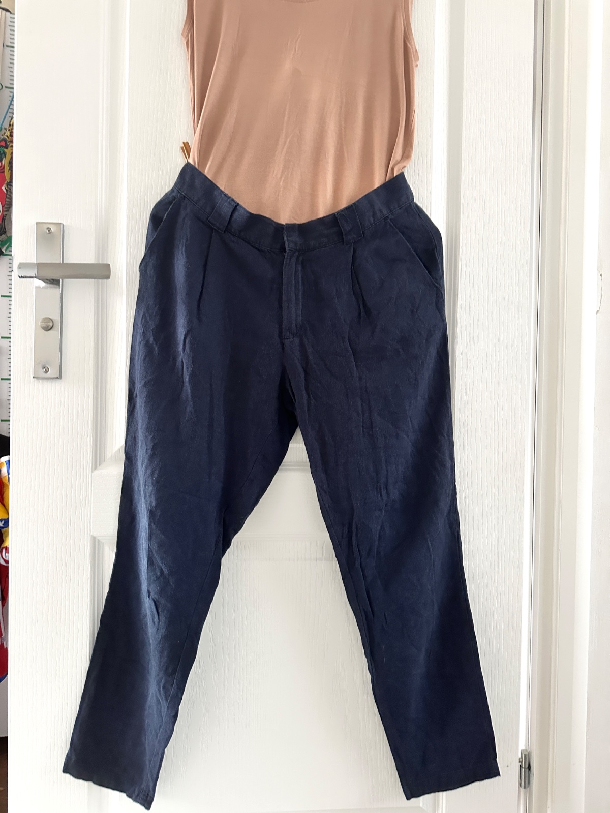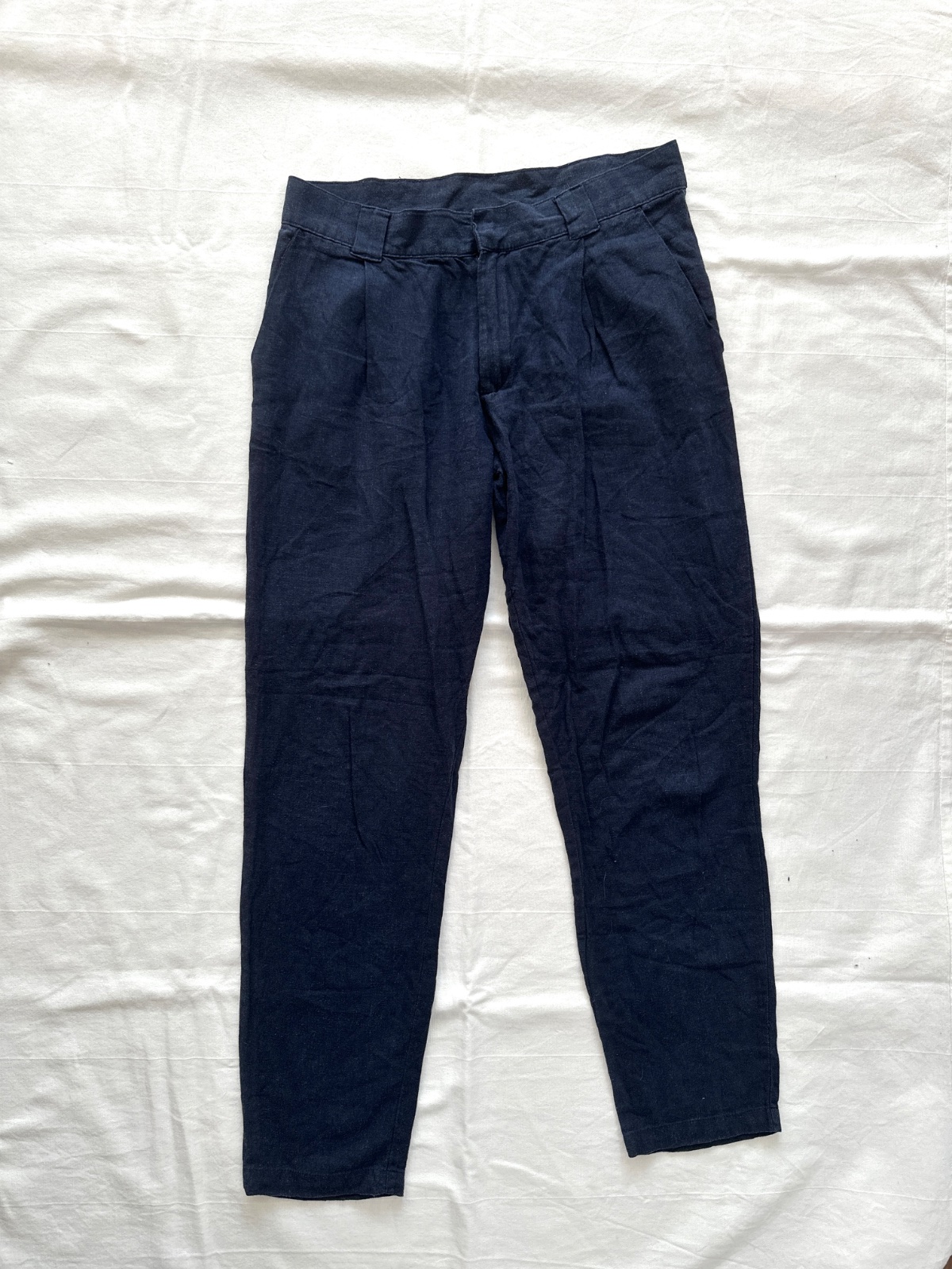 Ľanové nohavice s vysokým pásom v námorníckej modrej. Chinos nohavice. Zloženie je 55% ľan a 45% viskóza. Nohavice ako stvorené na horúce dni, ktoré môže sa nosiť na mnoho spôsobov. Oblečením mokasínov a saka vytvára elegantný styling. K nohaviciam môžete nosiť aj vysoké opätky alebo pre športový vzhľad tenisky či šľapky. Nohavice sú veľkosti 36, všetky miery sú na fotkách.