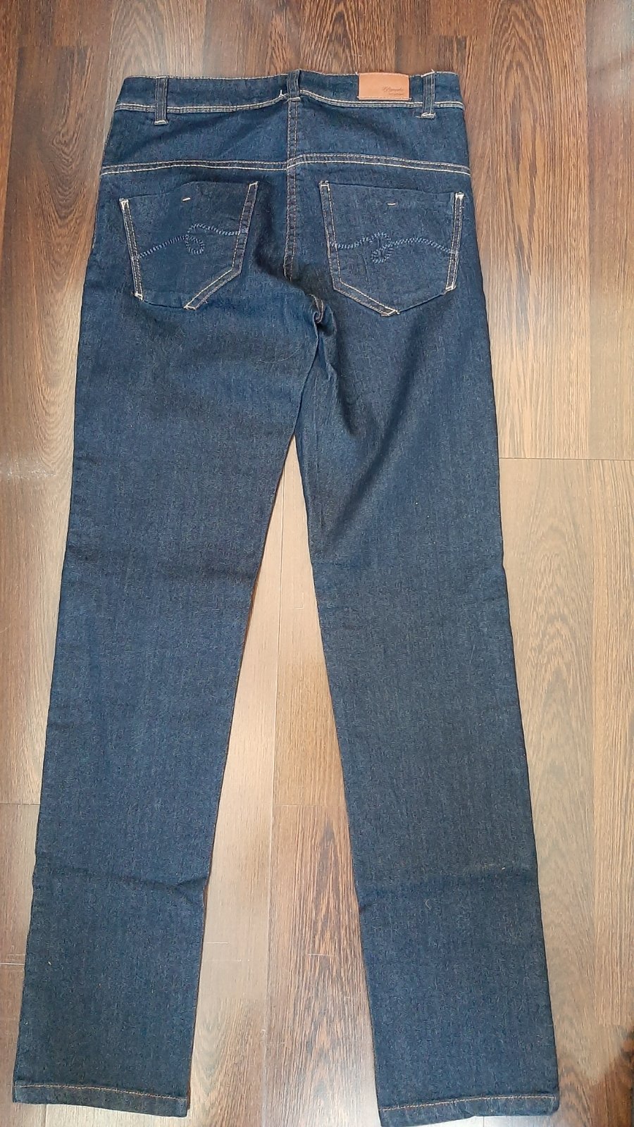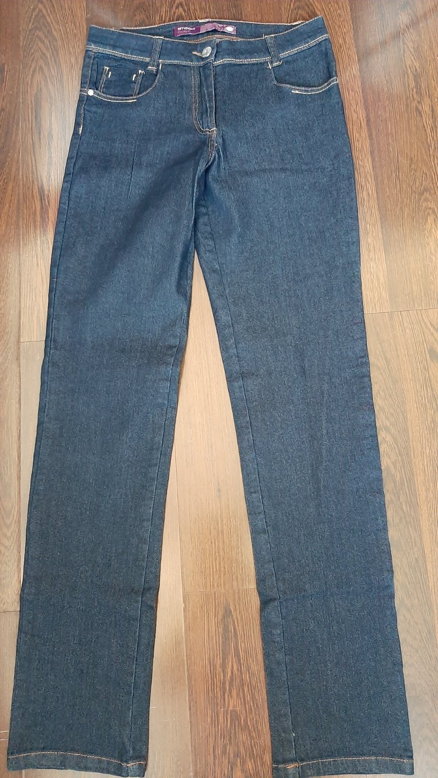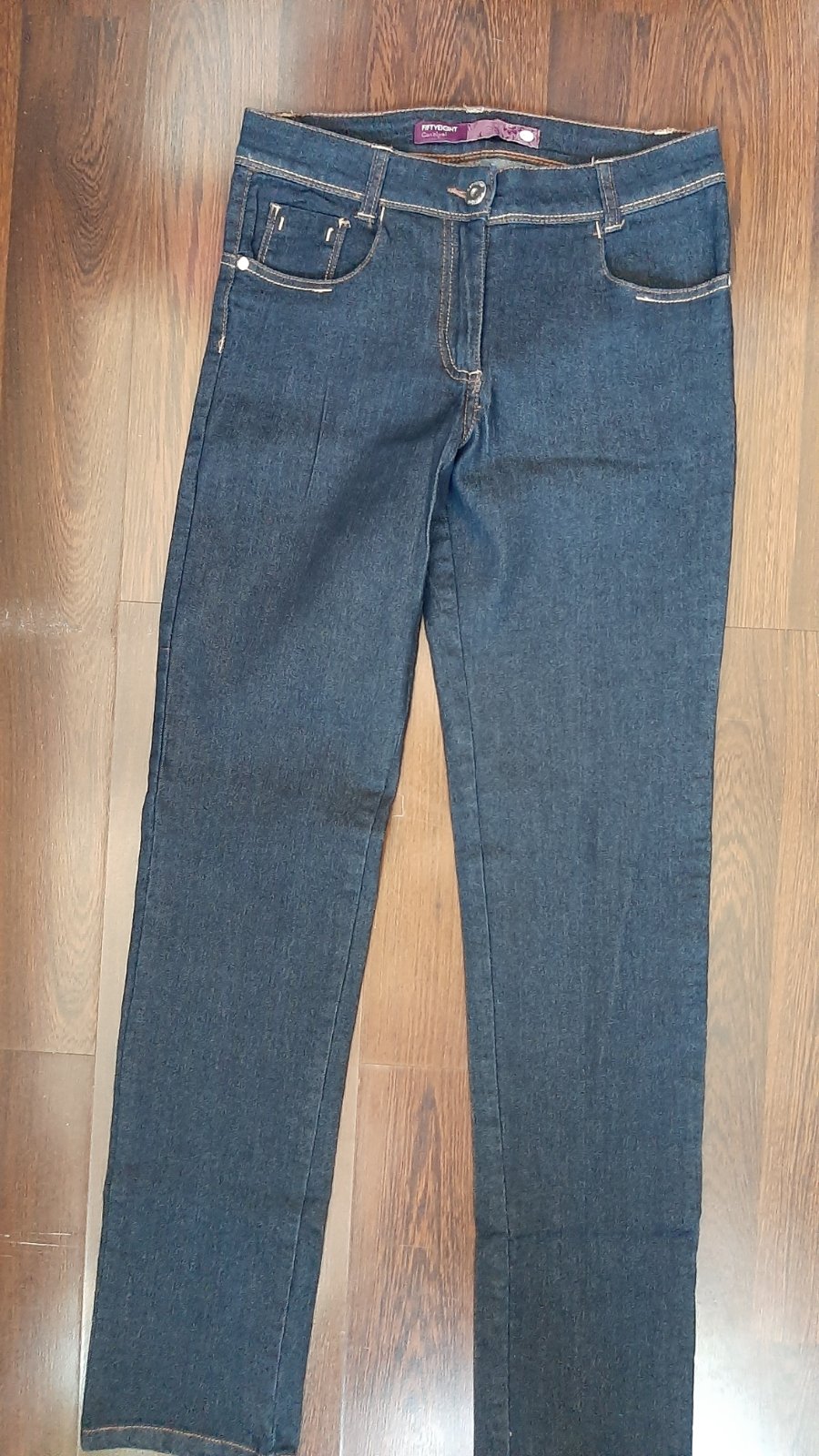 Nenosene rifle na nižšiu postavu rovného strihu s elastanom. Su velmi pohodlne. Zn. John Baner objednane v Bonprixe. Dl. 97 cm, od rozkroku 74 cm, pas je znížený 74-75 cm.