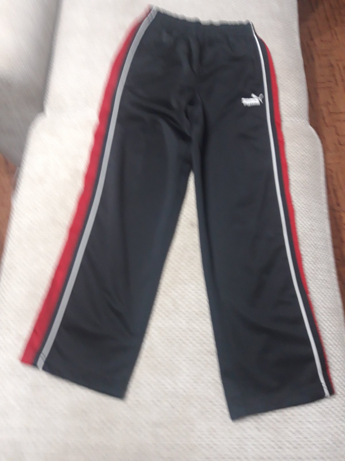 Tepláky nosené málo,majú na niektorých miestach biele vyblednuté miesta/fĺaky, ináč nezničené,nepotrhané,veĺkosť odhadom