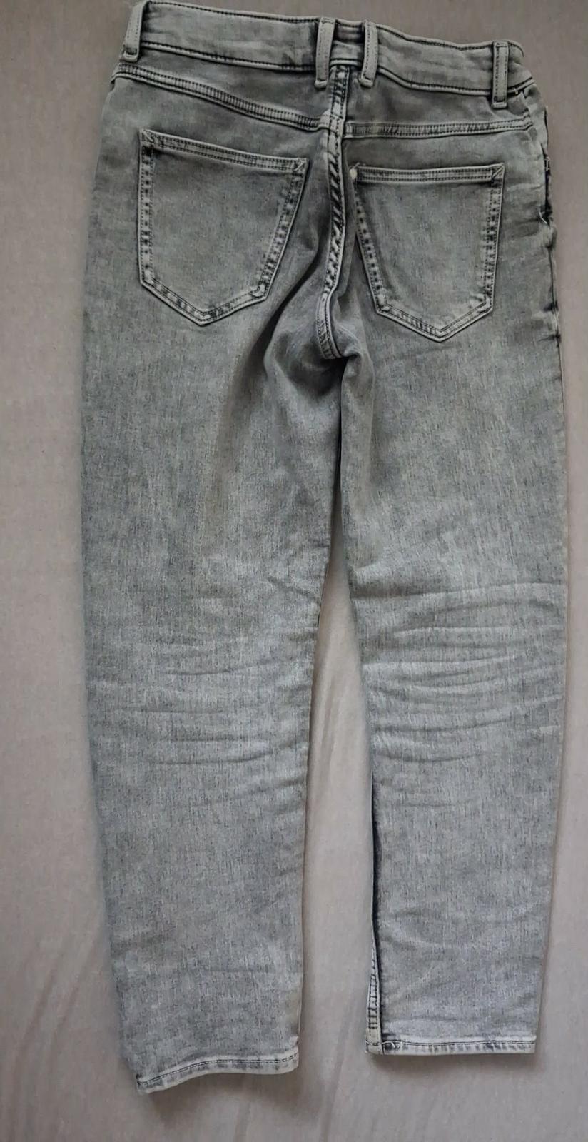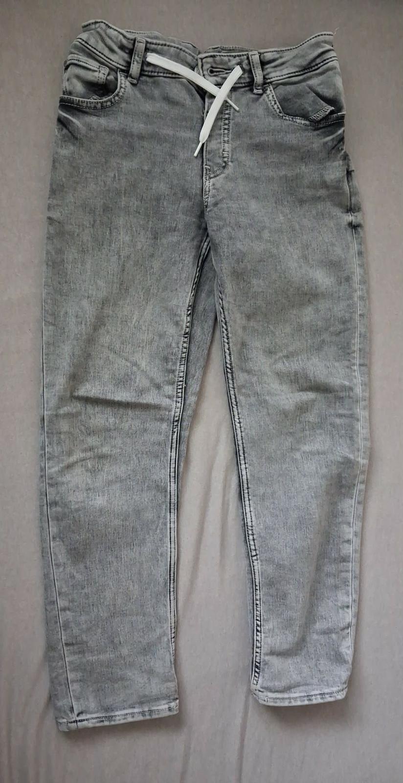 sivé rifle s elastanom, trochu hrubšie, H&M, veľkosť 146, v páse nastaviteľná guma, šnúrka, zapínanie na gombík, dlžka 90 cm, top stav, cena 18 €