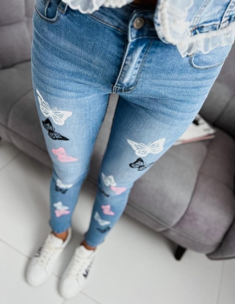 Modré rifle s motýlikmi Sabien sú skinny nohavice s push up efektom na zadku. Perfektne sa hodia pre svieže jarné outfity.