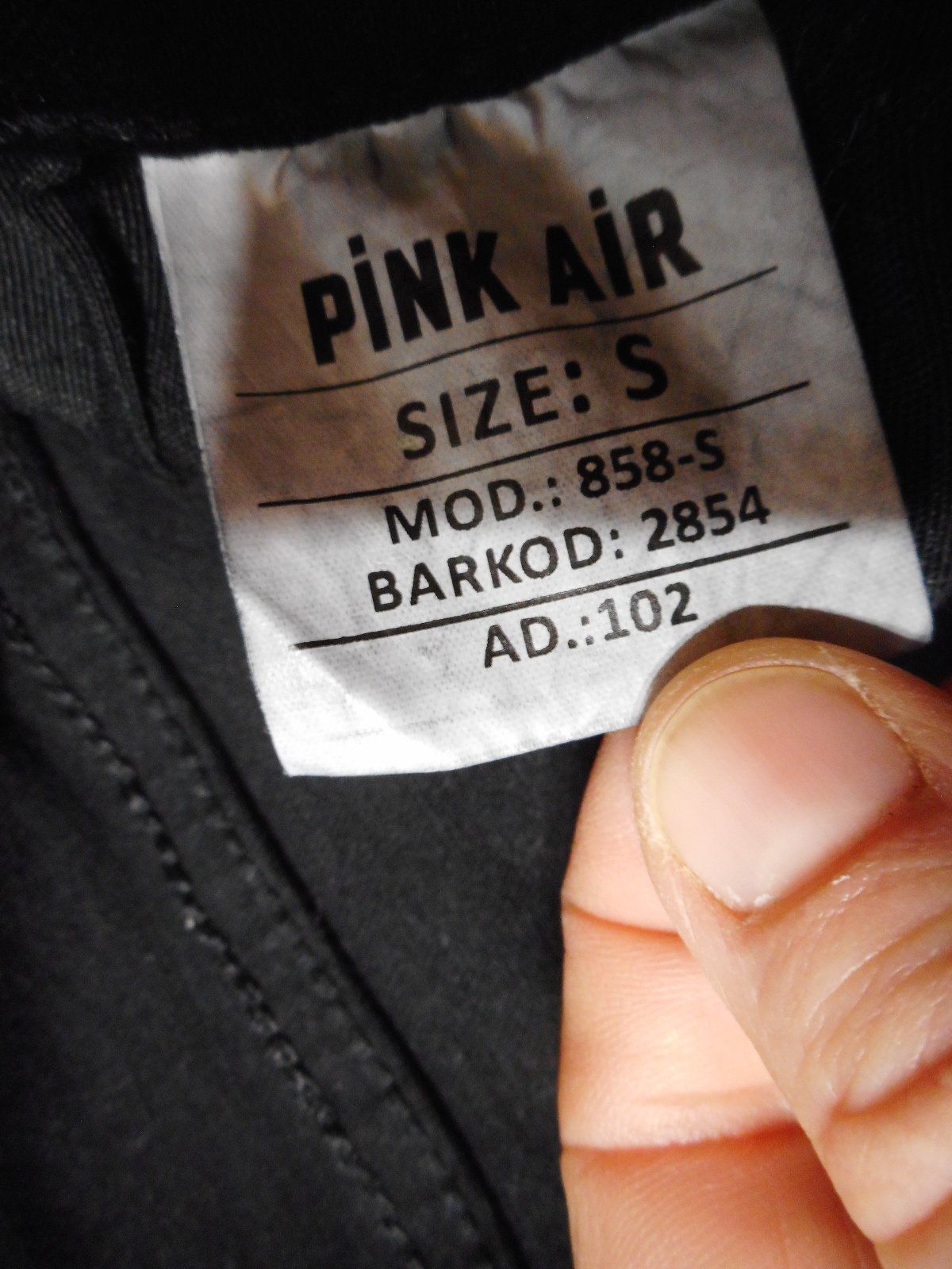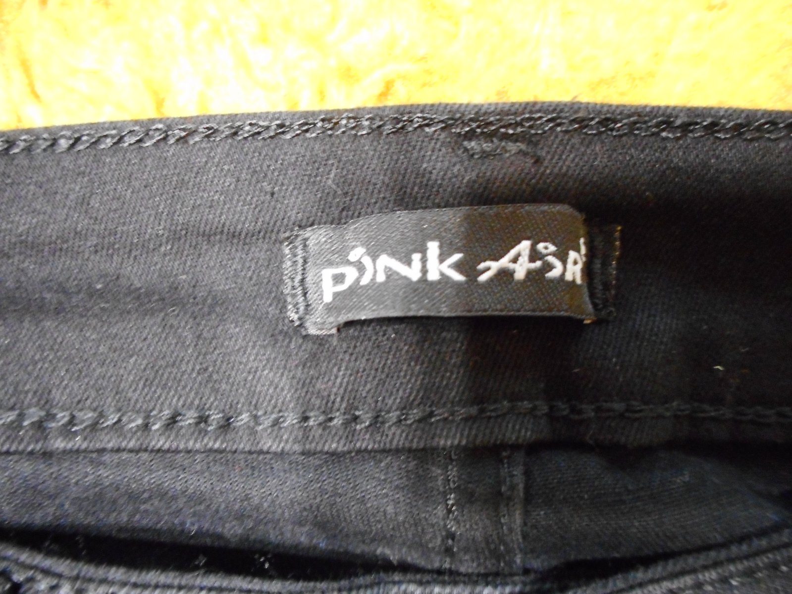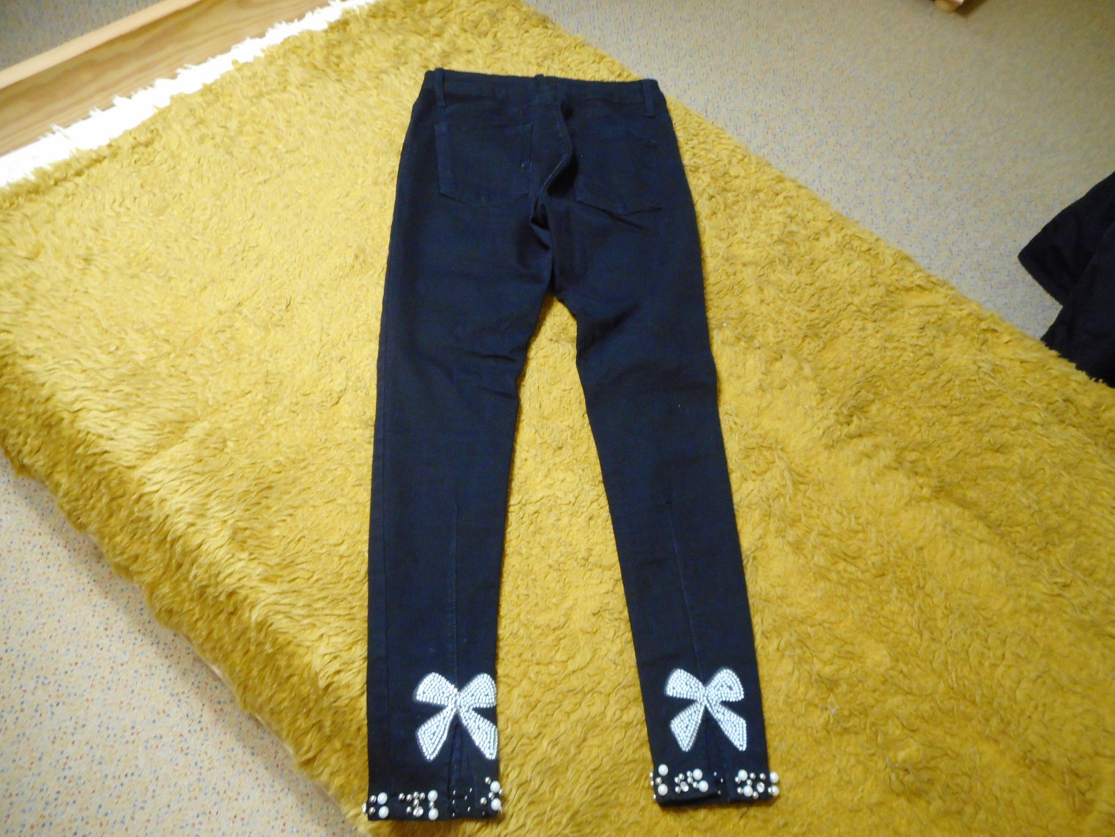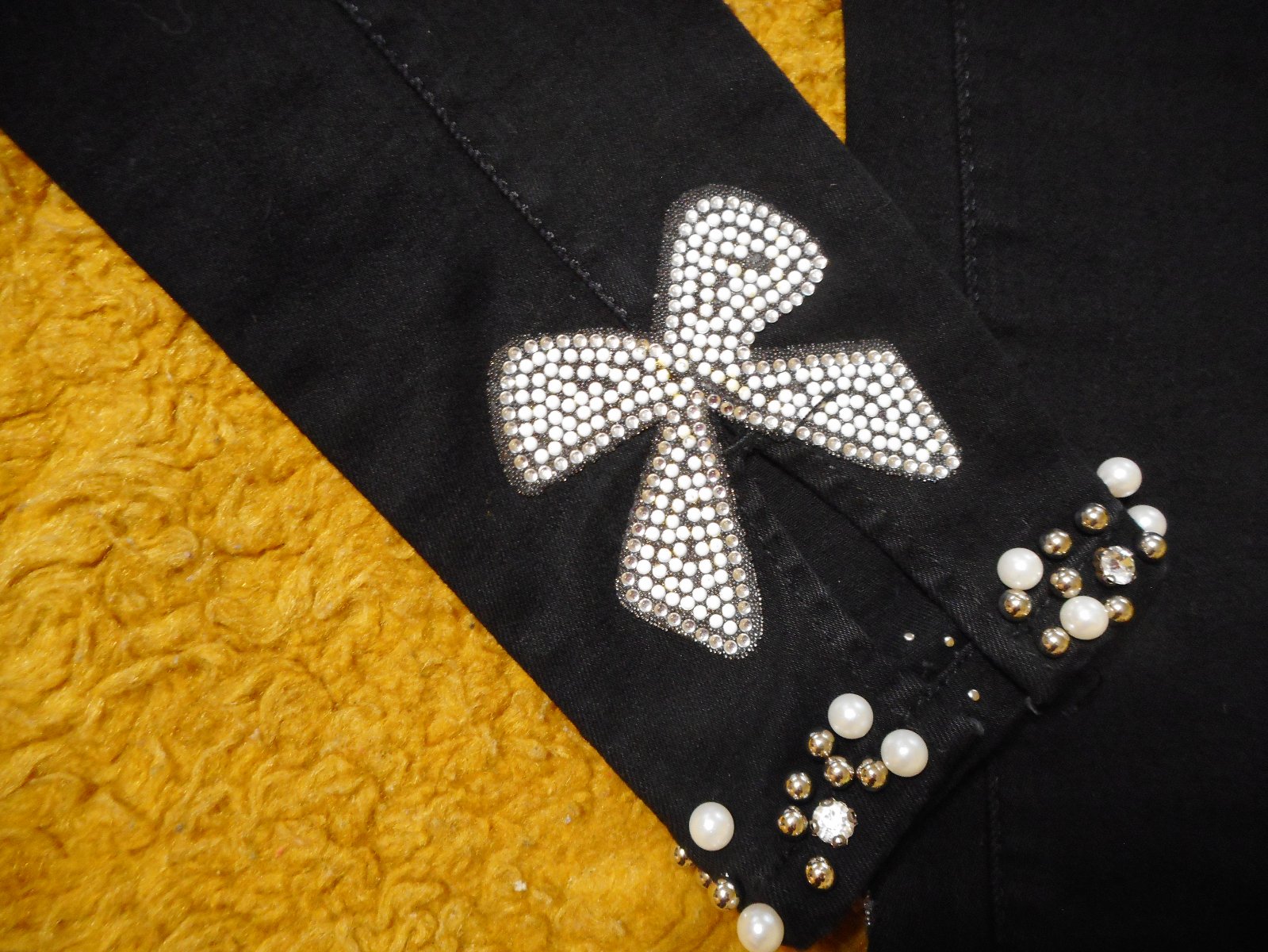 predám používané, nepoškodené nápadité čierne slim rifle zn Pink Air veľkosť S z pružného elastického materiálu, pričom ukončenie nohavíc tvoria vpredu dva rady bielych a strieborných gorálok a vzadu nápaditá nášivka s gorálkami v tvare mašle, pás v kľude je 33cm, celková dĺžka rifiel je 94cm