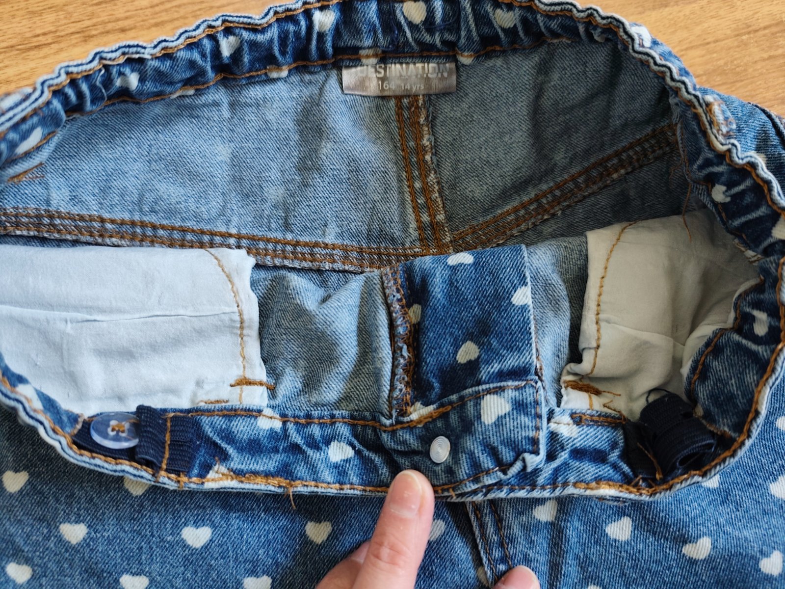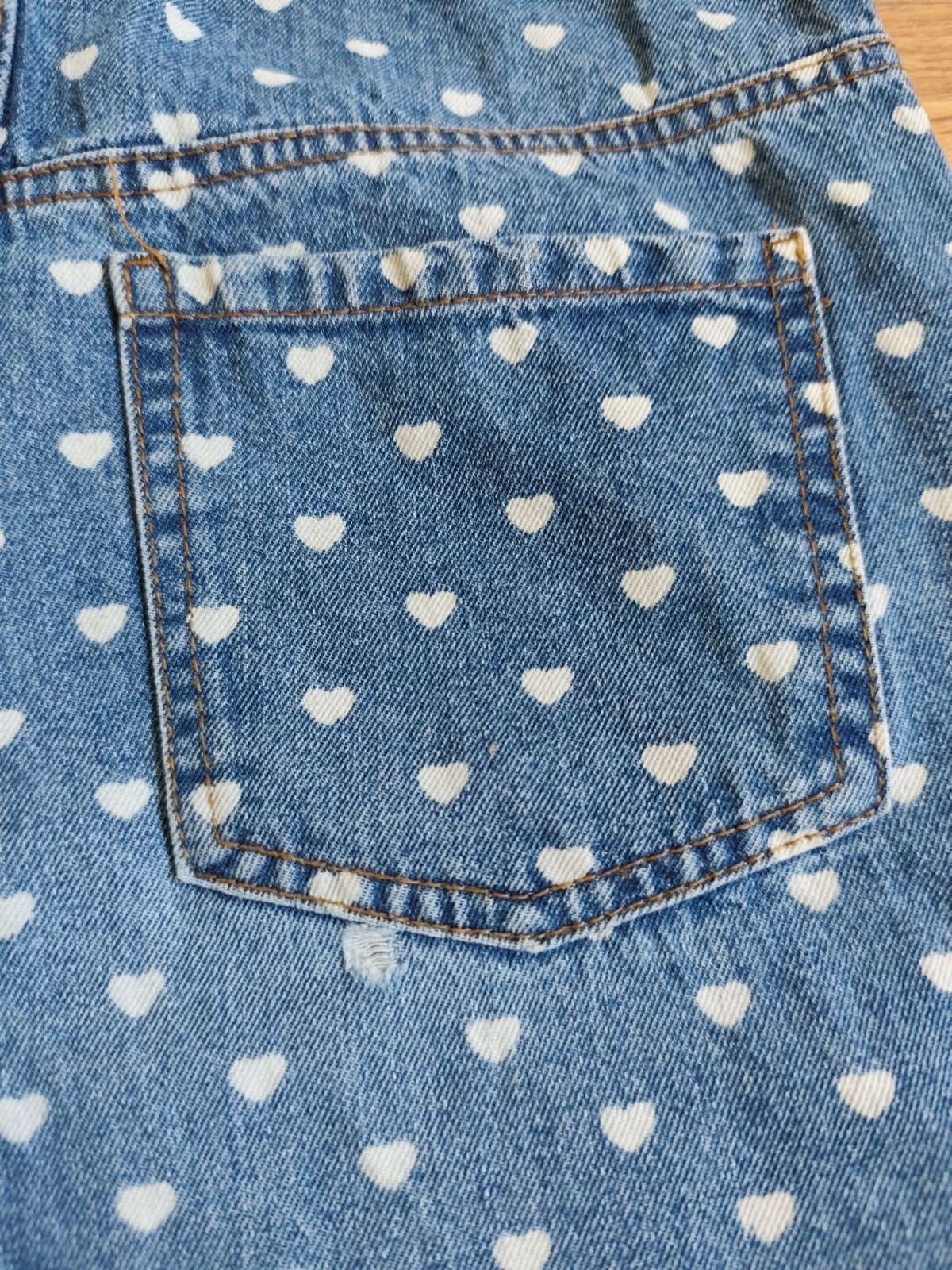 Jediná chýba pod jedným zo zadných vreciek je trhlina. Kvôli tým srdiečkam to nebije do očí . Viď posledné foto