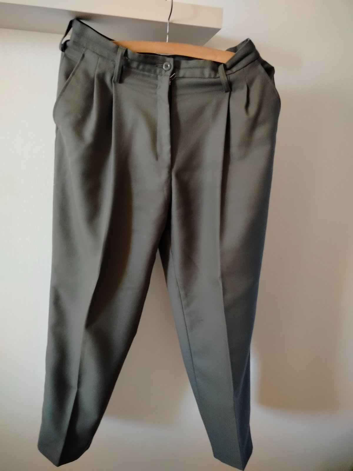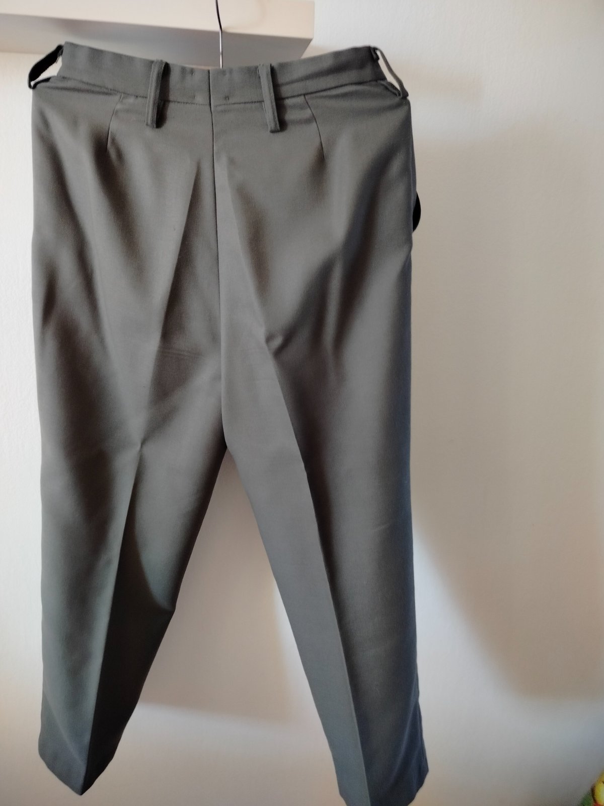 Strih: vysoký pás, opaskové pútka, zapínanie na gombík + zips, rovné nohavice zužujúce sa dole, vhodné na niššie postavy. Veľkosť označená 2-50 (pás približne 85 cm, dĺžka 100cm.