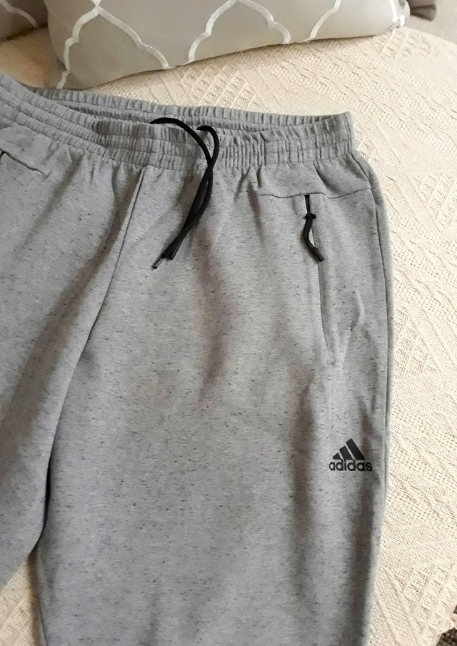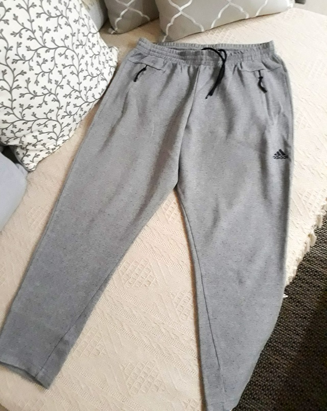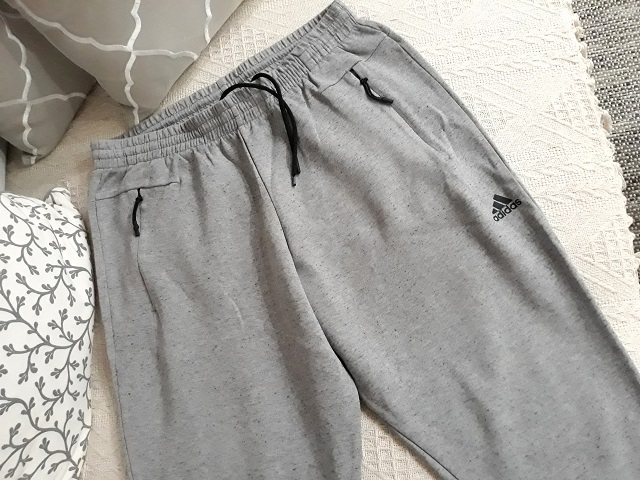 Na predaj pánske tepláky zn. Adidas, veľkosť "L". Sivá farba s jemným vzorom. Po bokoch sú vačky. V páse gumy a čierna šnúrka. Šírka pásu 43cm, vonkajšia dĺžka vrátane pásu 93cm, vnútorná dĺžka od rozkroku 65cm. Tepláky sú nepoškodené, ako nové, zachovaná farba.