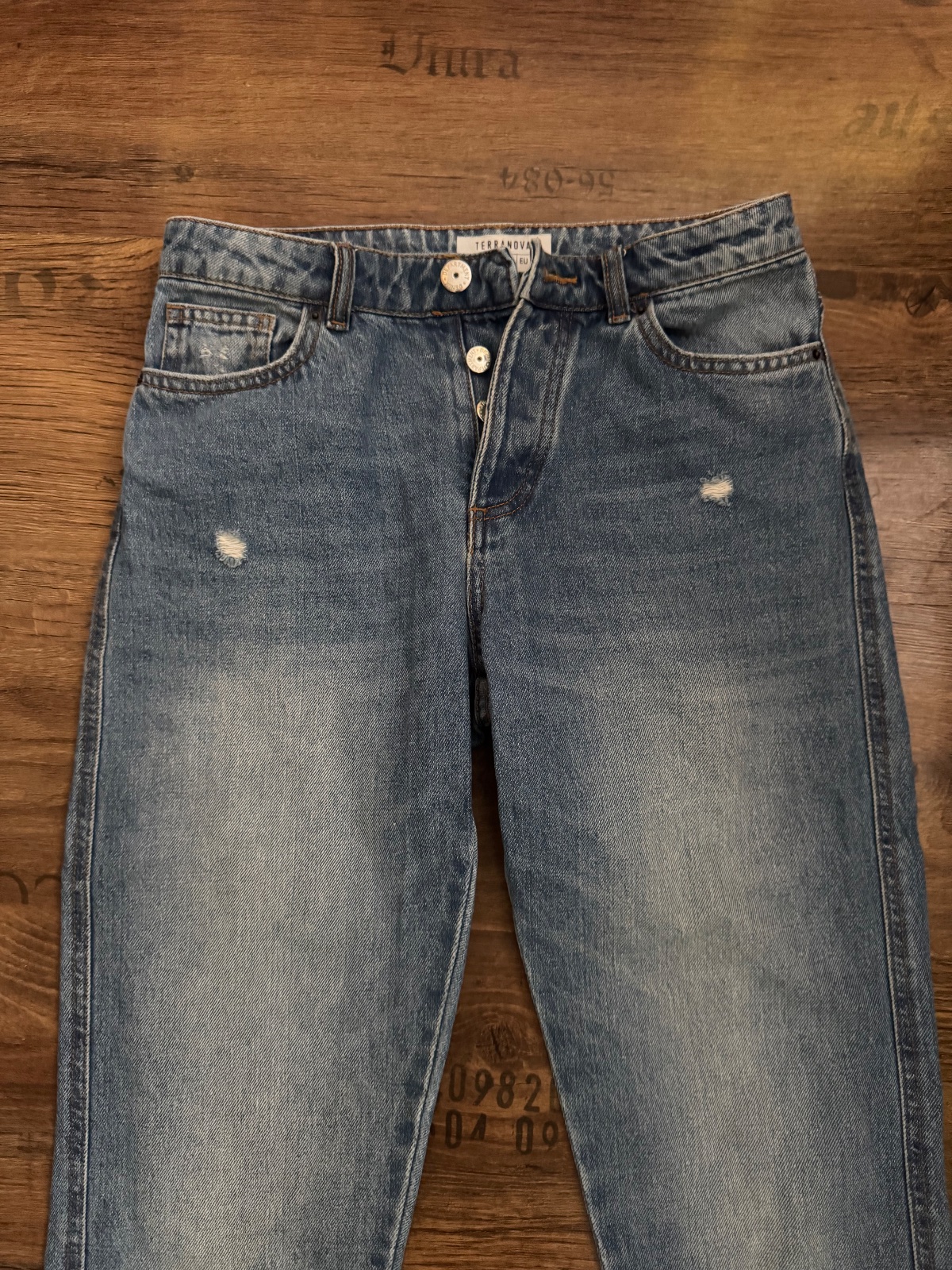 Ponúkam perfektné na spodku roztrhané rifle značky Terranova. Pekne sadnú a vyzerajú efektne. Veľkosť je uvedená 34, sadnú už aj na dievčenskú postavu alebo na XS, rozmery viď. foto. Vo vynikajúcom stave. Poštovné podľa taríf.