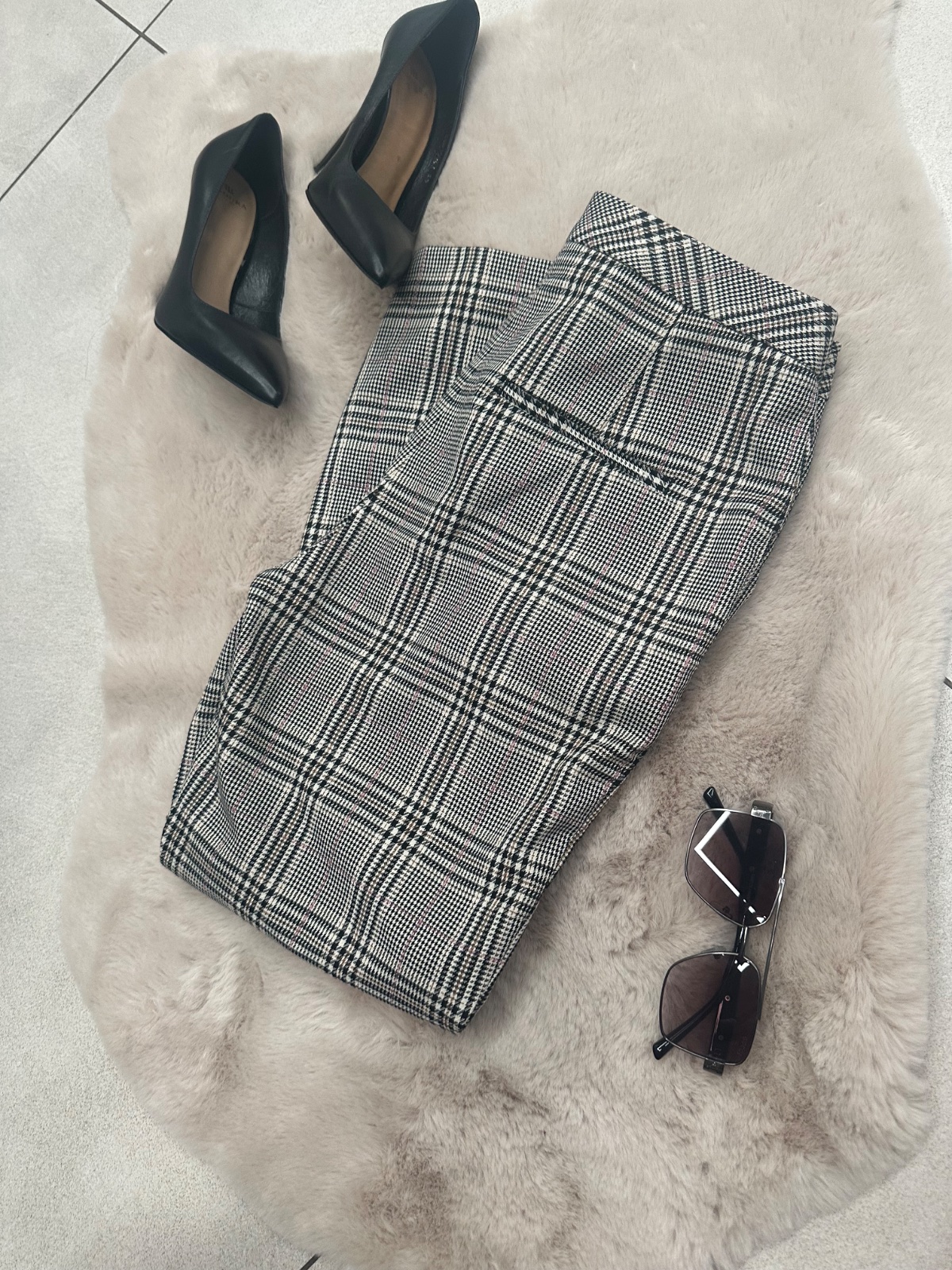 Kvalitné dámske elegantné nohavice tmavosivej farby, zapínanie na zips a háčik, materiál 64% polyester, 34% viskóza, 2% elastan, super stav. šírka v páse 39x2 cm, boky 50x2 cm, dl. 100/76 cm, sedy...