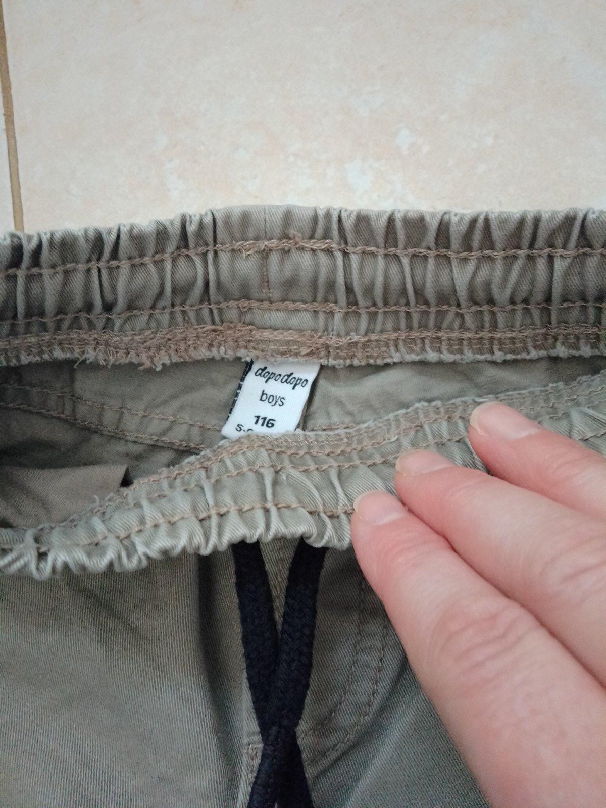 Nohavice podšité veľkosť 5-6rokov, bez poškodenia, trochu vidno pranie, ale určite ešte vhodné do škôlky či školy. V páse je našitá gumička, aby sa nemuseli viazať šnúrky.V