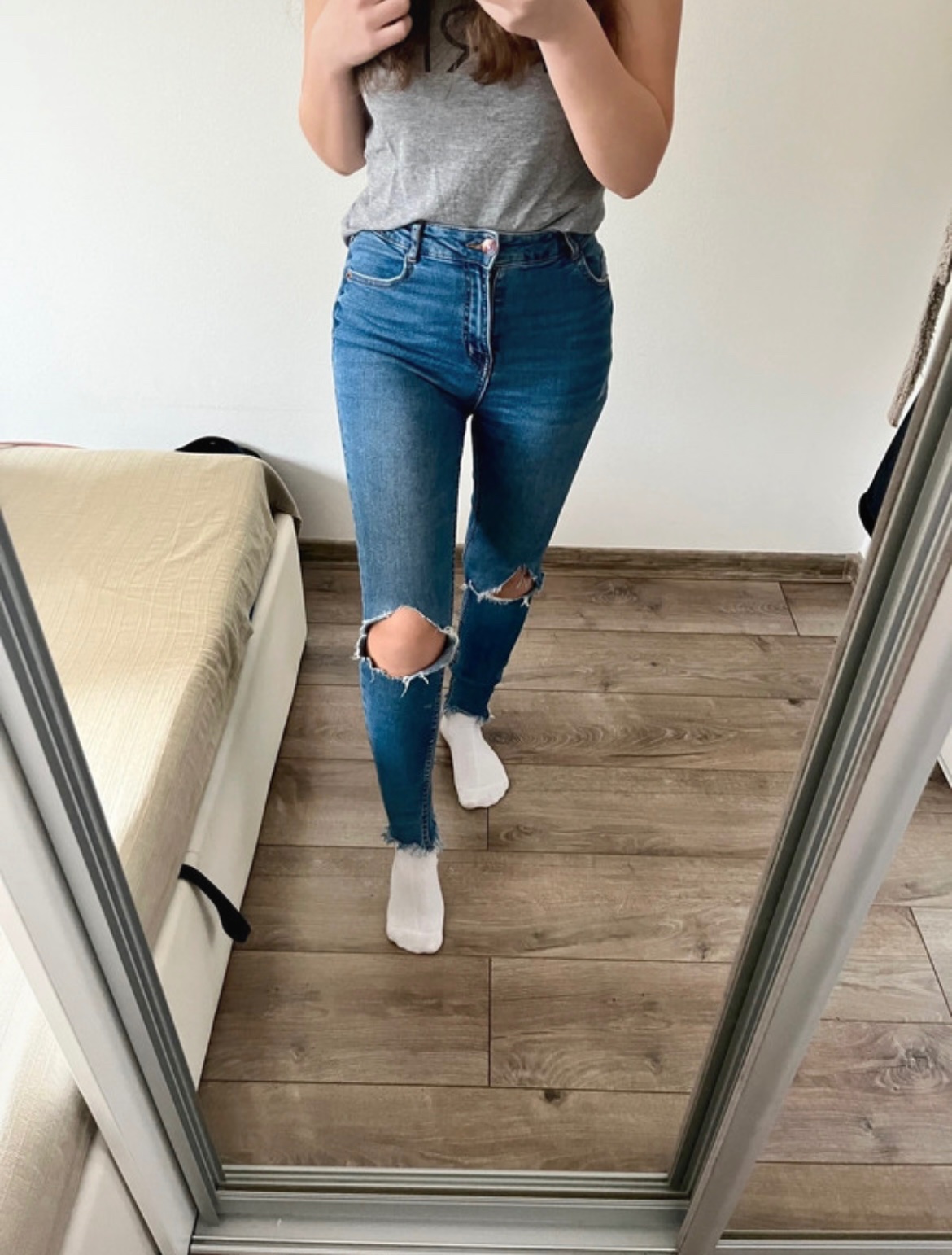 Skinny rifle s vysokým pasom a dierami na kolenách