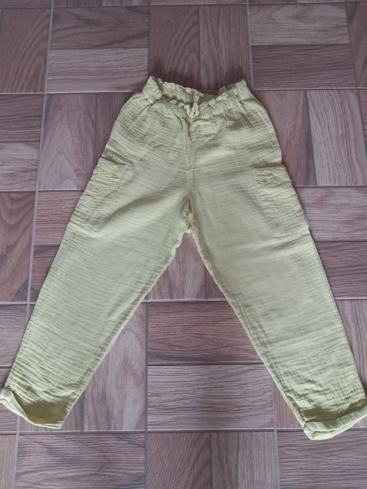 Skrátené, ľahké, bavlnené kaki nohavice s výšivkou pre 7 ročné dievčatko. Dĺžka 54 cm.