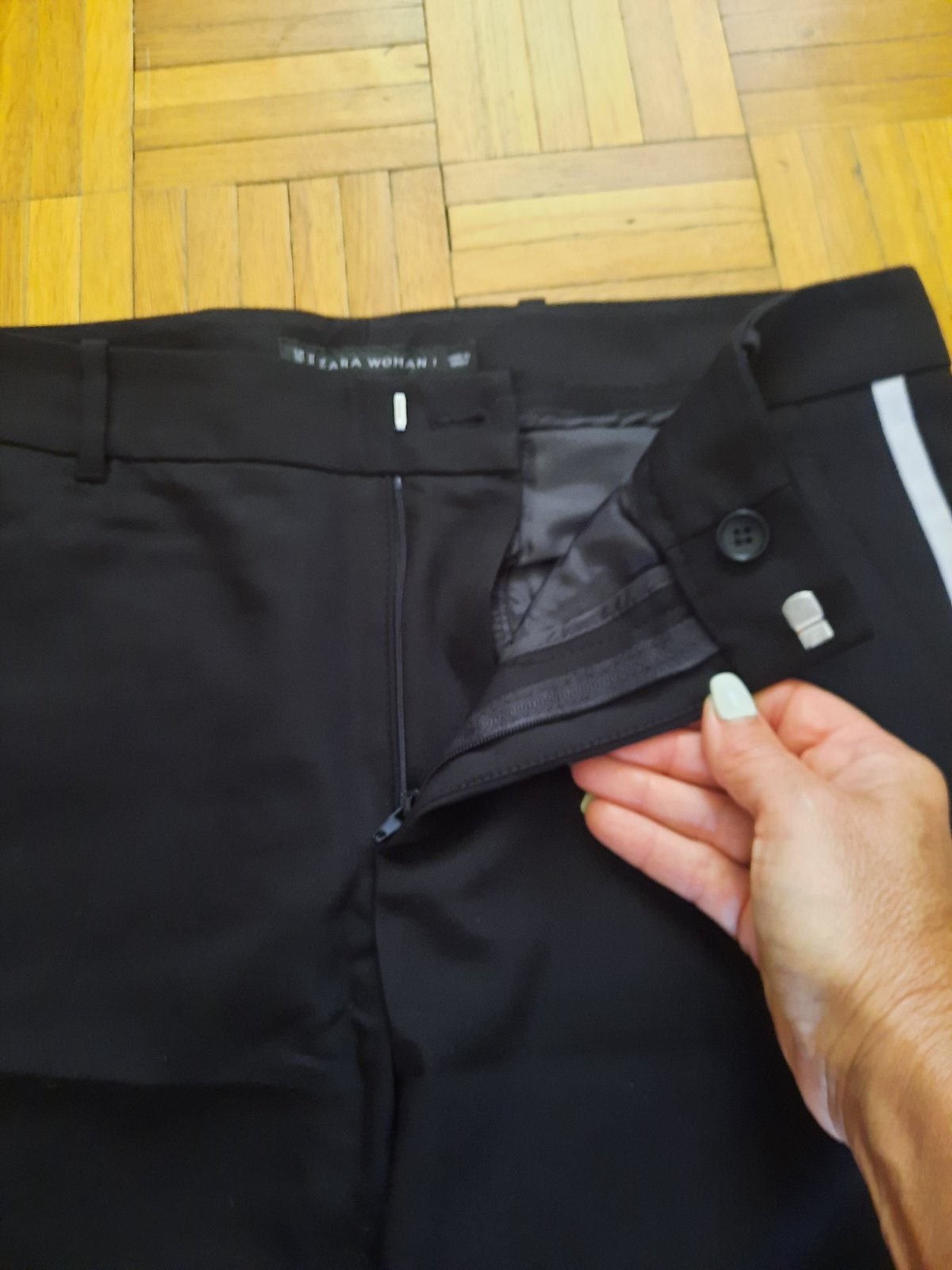 Predam nohavice znacky Zara,velkost M,cierna farba,miery su vo foto,povodna cena 29,95 jemne lahka latka..aj na sportovo aj elegantno sem tam jemnunke zatiahnutie ale nie je to vidiet