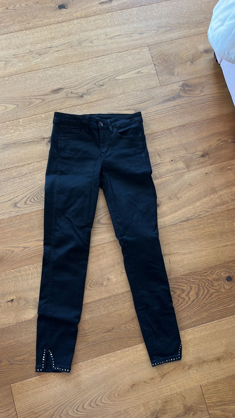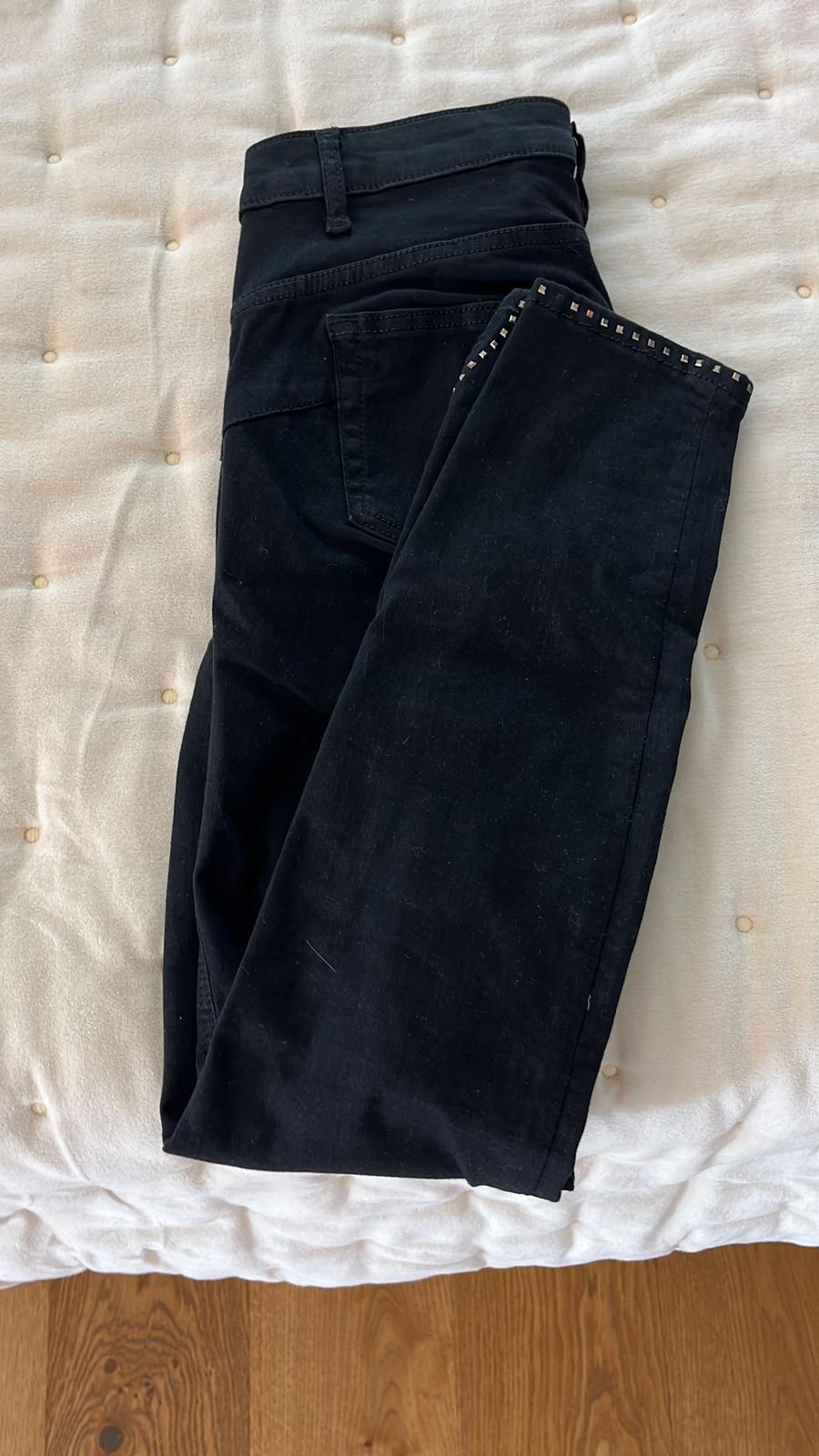 Krasne rifle s ozdobnymi aplikaciami na spodku nohavic