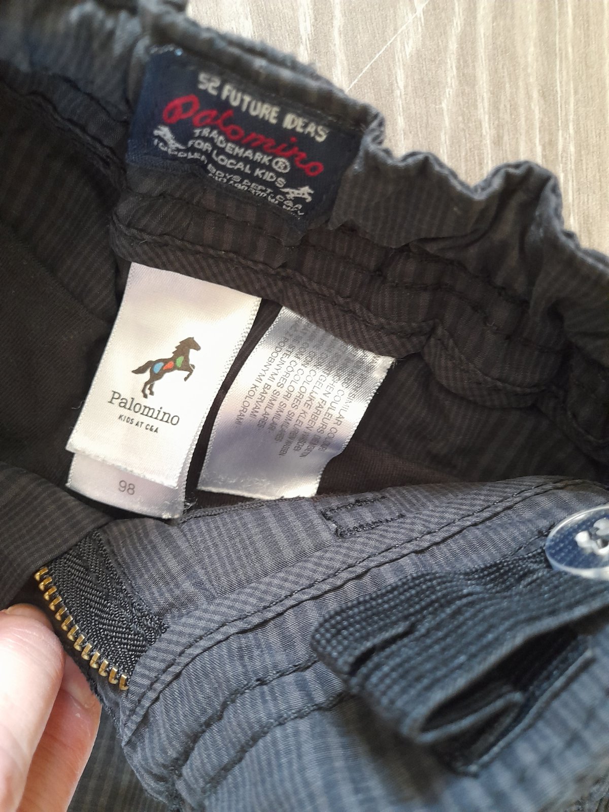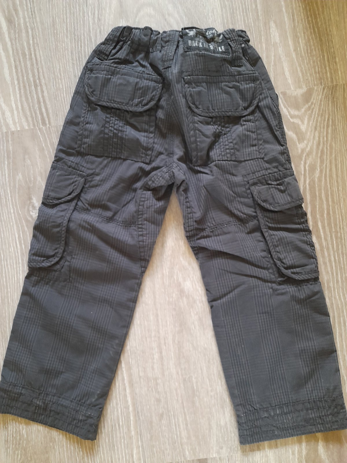 Vyborny stav, bez poskodenia. Nohavice su podsite bavlnenou latkou, vhodne na chladnejsie jesenne jarne pocasie. Maju po bokoch kapsove vrecka. Vzor jemne karo. V pase regulovatelna guma s gombikom.