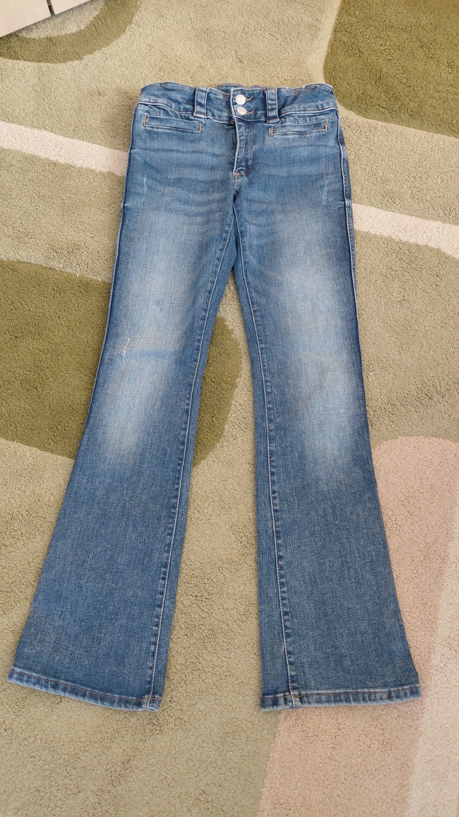 Vo vľlmi peknom zachovalom stave.Vhodné skôr pre štíhlejšie dievčatko.Nádherne sedia na postave.Pás regulovateľný gumičkou.Rozmery viď.foto. veľkosť písaná 164 ale sú trochu menšie, skôr 158.