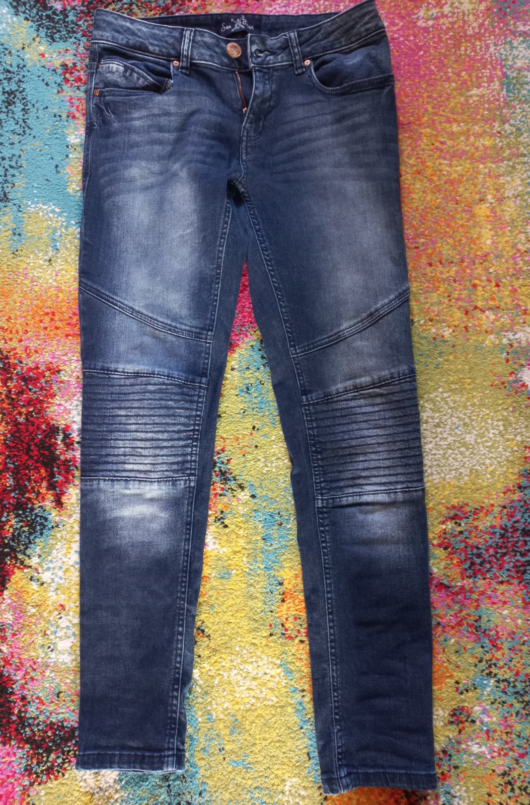 Krásne a skvelé mäkké rifle, poddajné, pekná farba Profesionálne zašitá diera na kolene, cena symbolická Dĺžka 98cm Pás 39cm Elastické